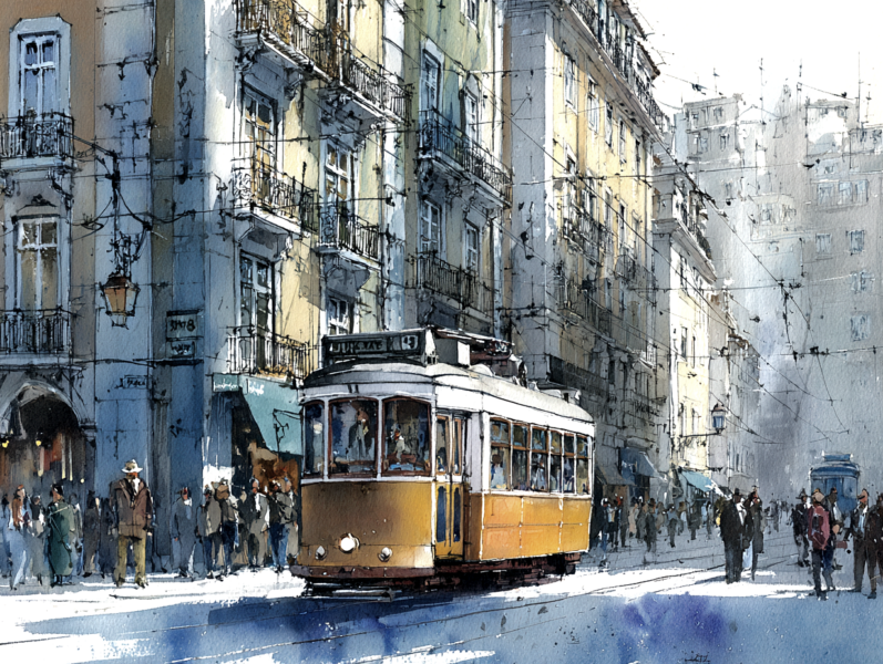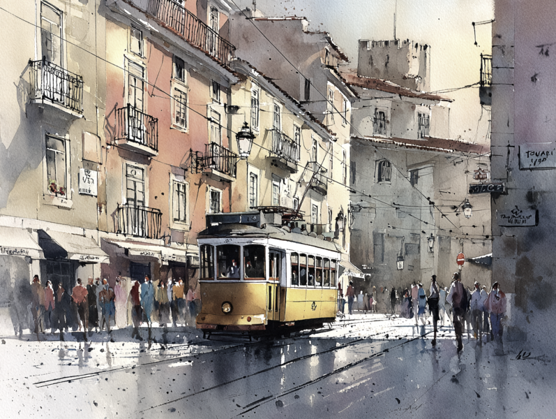 1970s Lisbon street scene, classic yellow tram (Lisbon tram 8) moving through a narrow cobblestone street, historic European architecture, tall pastel buildings with balconies, pedestrians walking and gathering, lively atmosphere, bright sunlight casting strong shadows, warm highlights and cool blue shadows, watercolor painting style, soft color washes, loose brush strokes, splatter effects, fine ink line sketch details, urban sketch style, dynamic perspective from street level, slightly tilted composition, light and airy feeling, high detail, artistic, impressionistic realism