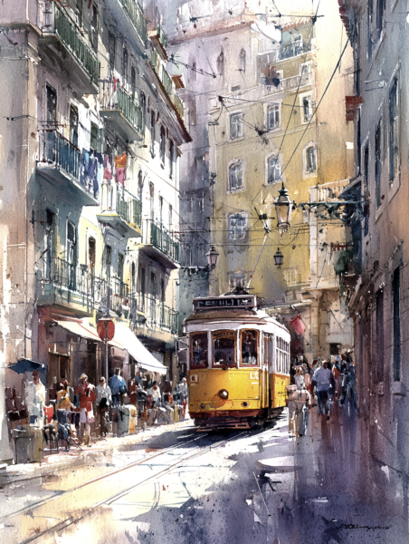 This piece takes us back to the 1970s. It captures a sunny afternoon where a vibrant yellow tram climbs up a narrow, cobblestone hill. It used soft watercolor paints mixed with thin ink lines to give it a "rough" and artistic look. My favorite part is the contrast between the bright sunlight and the deep blue shadows on the ground—it makes the whole scene feel alive!