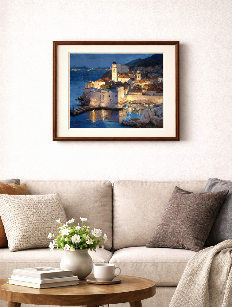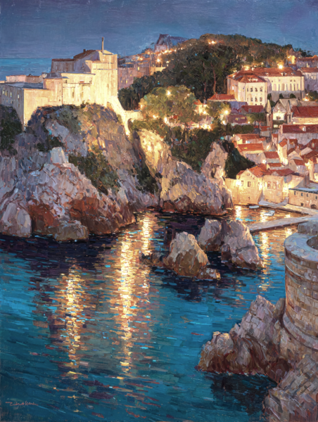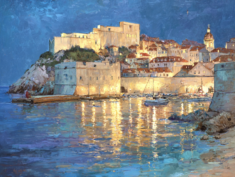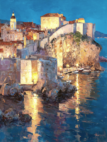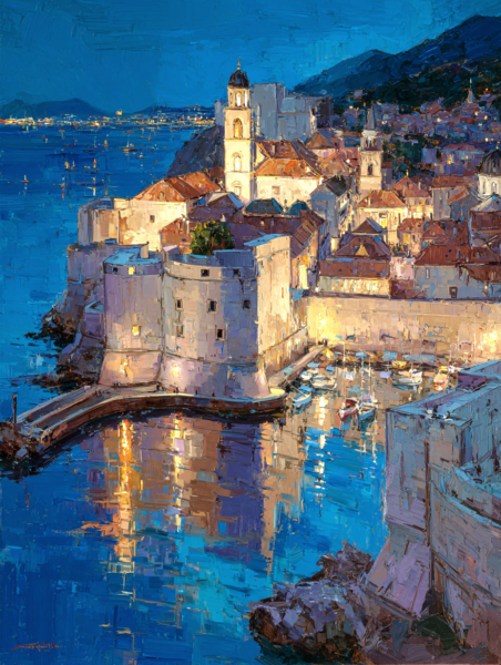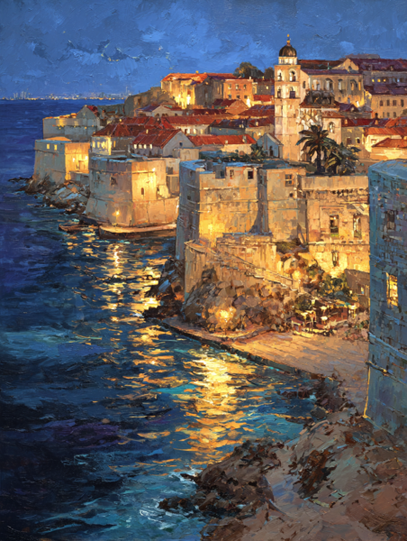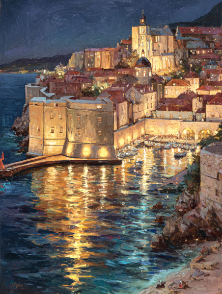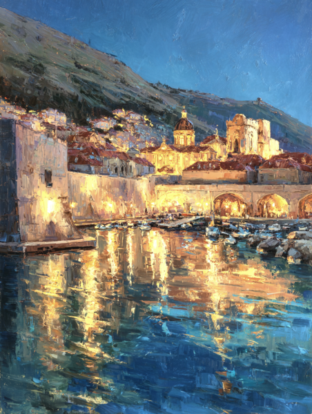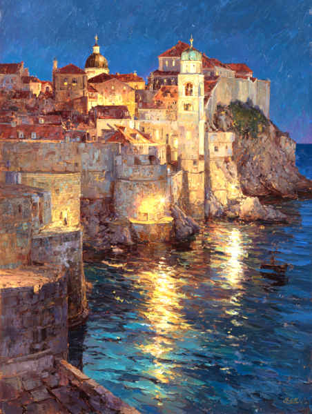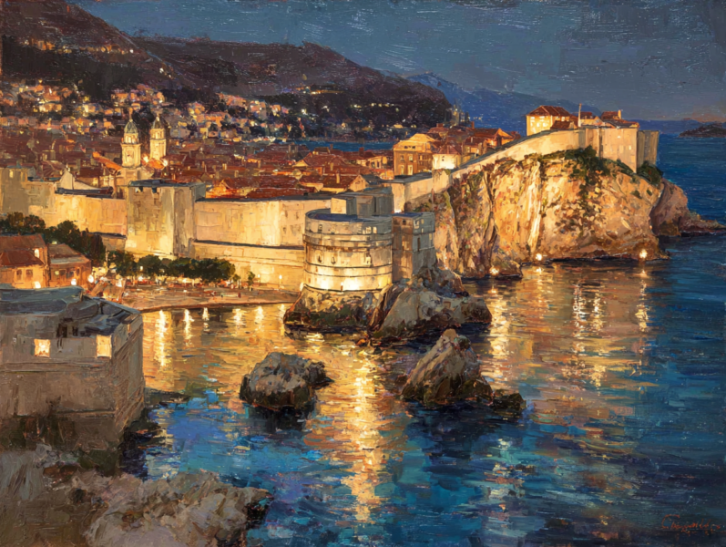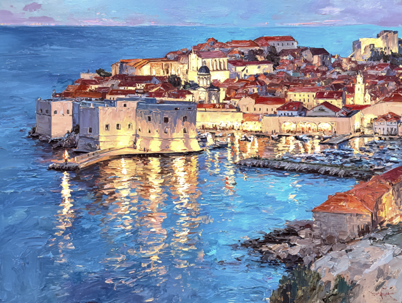 Do you know that magical time just before the sun rises? This oil painting captures that special moment in Dubrovnik, Croatia. The city is famous for its historical stone walls and its beautiful location by the Adriatic Sea.