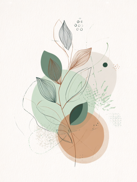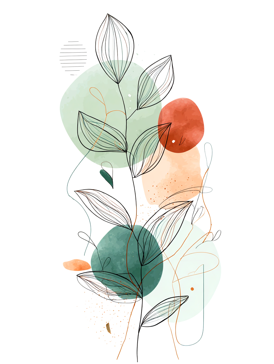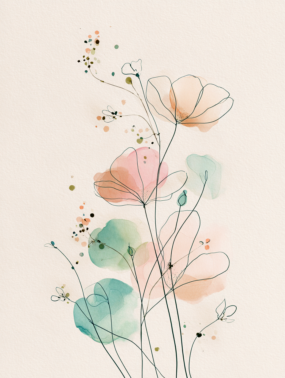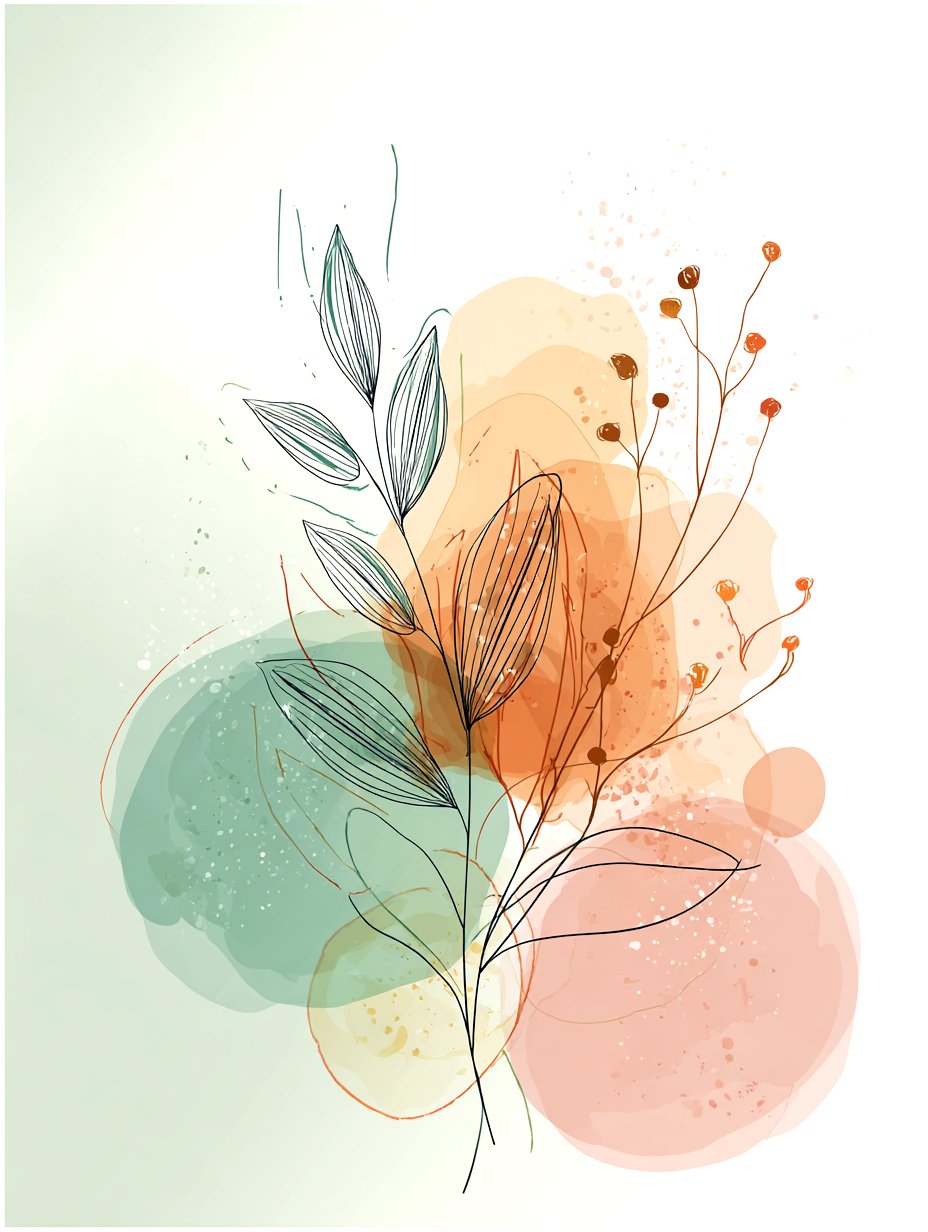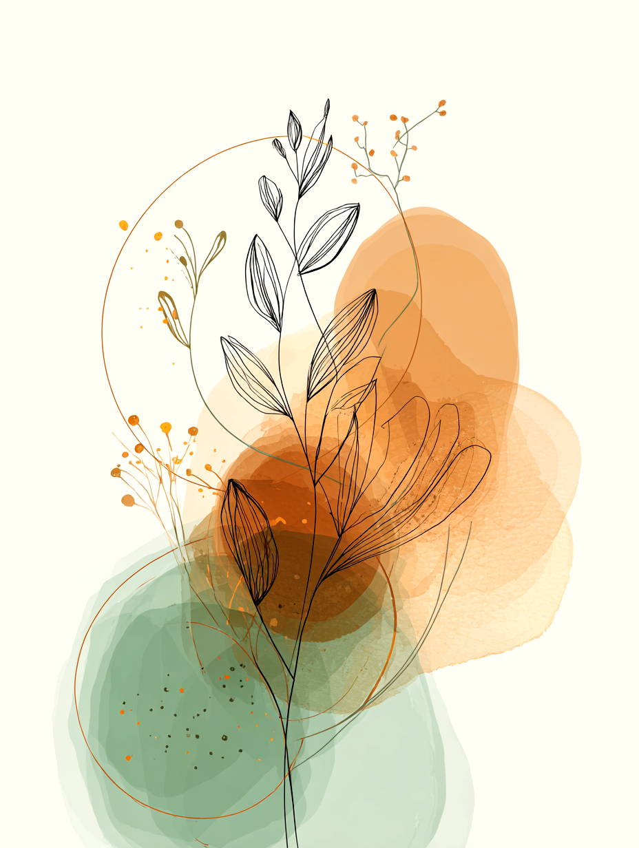 modern bohemian botanical illustration, delicate line drawing watercolor style, stylized plant branch with thin elegant leaves and small flowers, fine ink line art combined with soft watercolor washes, mint green, sage green, beige, warm earth tones, subtle pastel accents, abstract organic shapes in background, translucent watercolor circles, minimalistic and airy composition, contemporary aesthetic, calm and inspiring mood, clean white background, balanced negative space, smooth gradients, hand-drawn feel, high detail, refined and elegant --ar 2:3 --style raw --v 6 --s 250