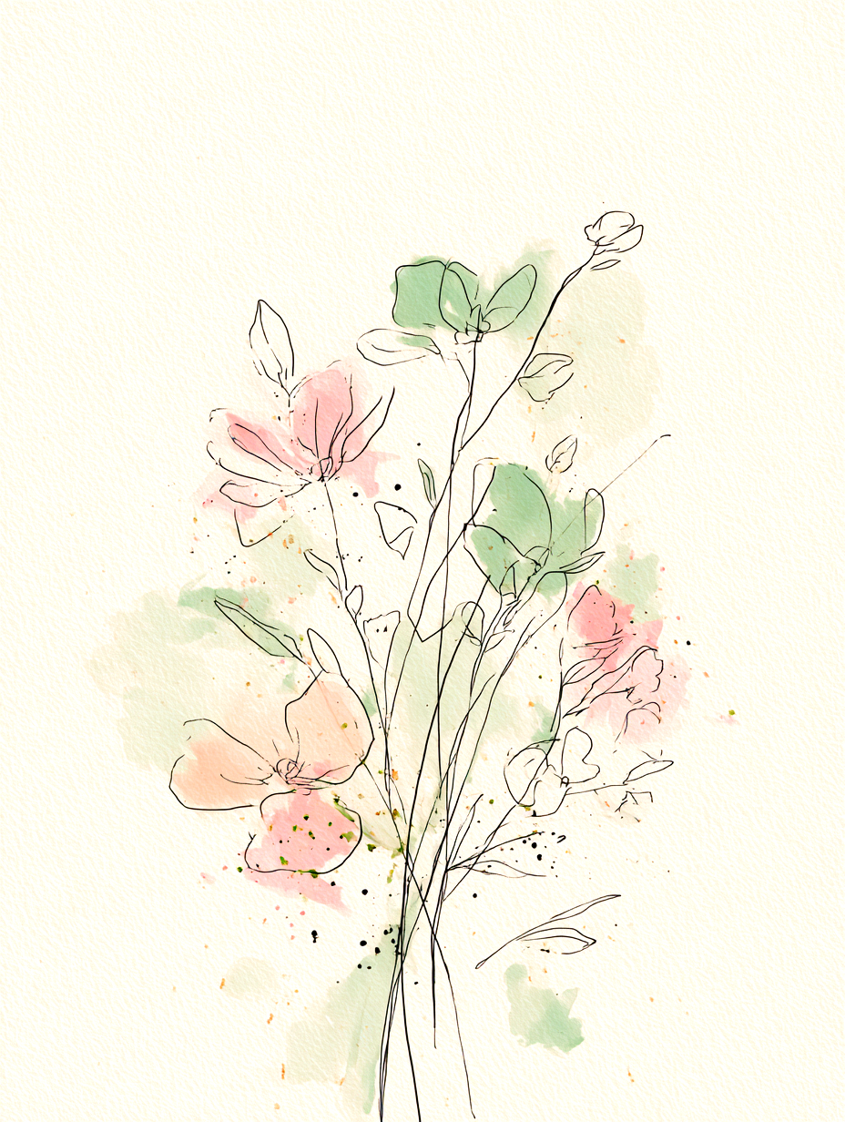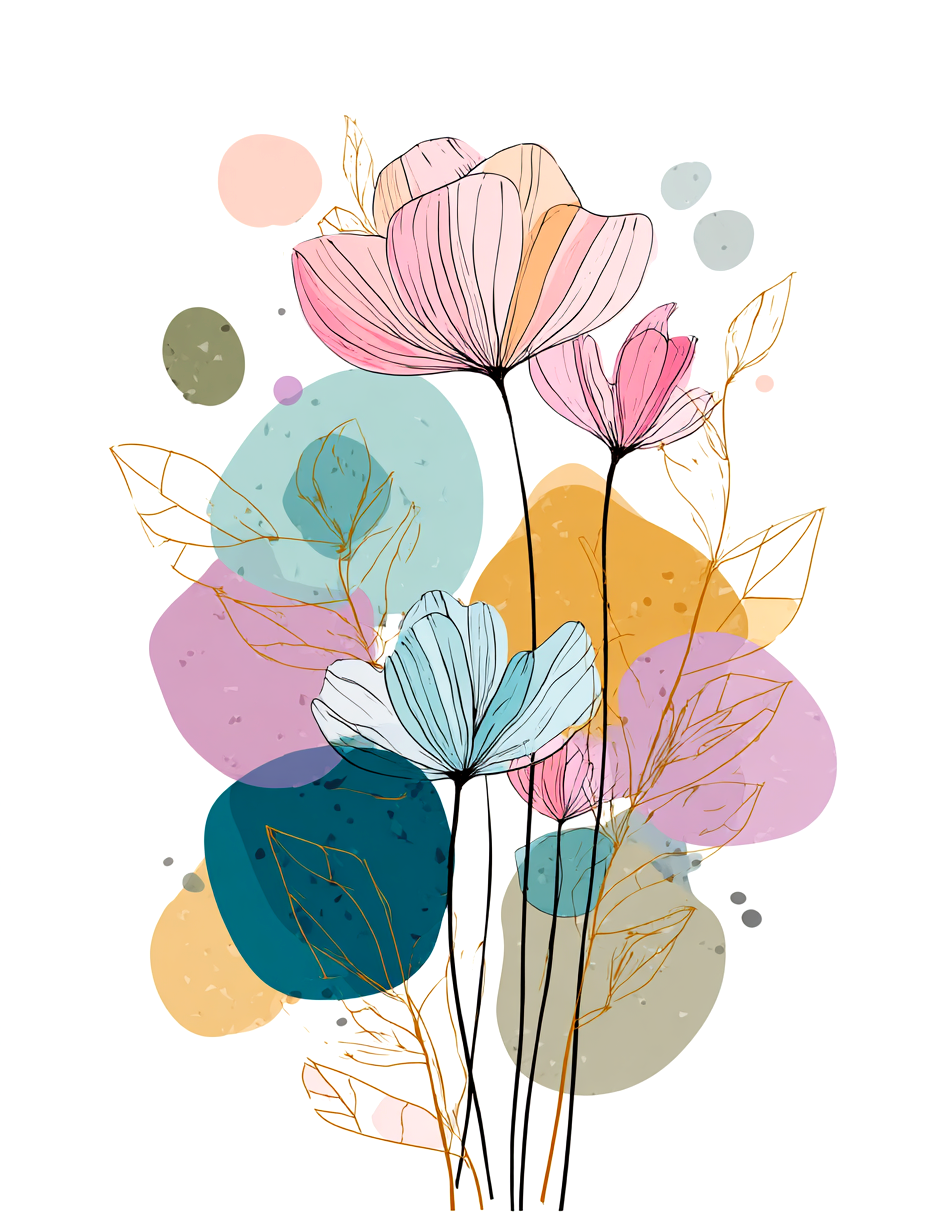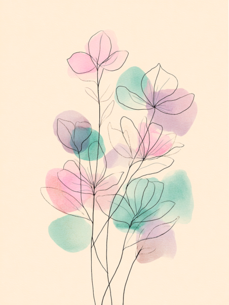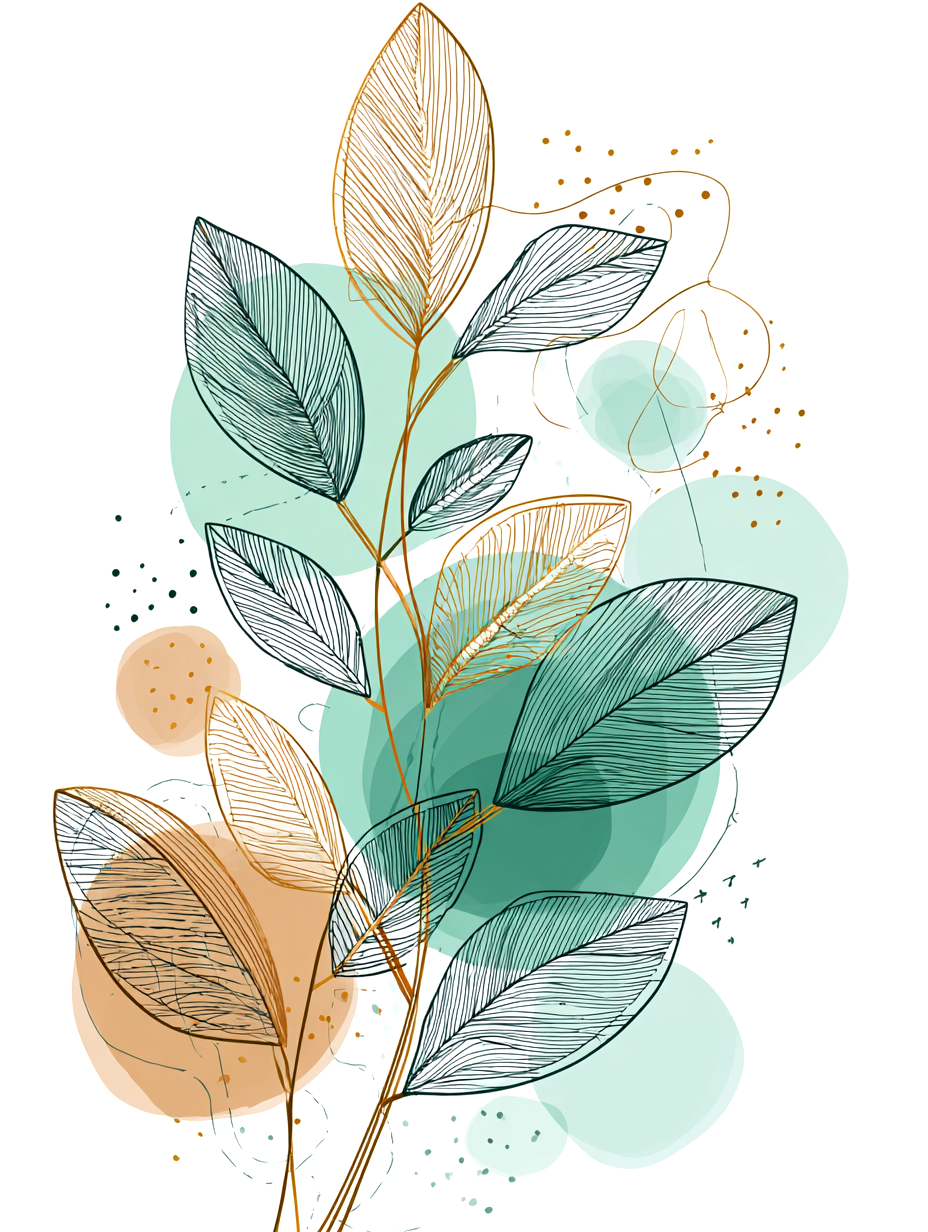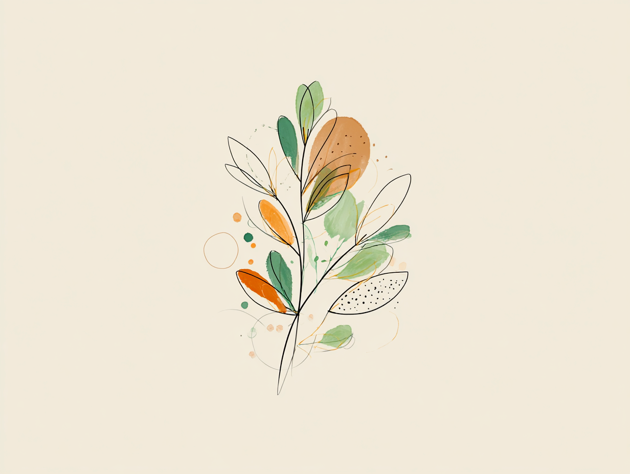 modern bohemian botanical illustration, delicate line drawing watercolor style, stylized plant branch with thin elegant leaves and small flowers, fine ink line art combined with soft watercolor washes, mint green, sage green, beige, warm earth tones, subtle pastel accents, abstract organic shapes in background, translucent watercolor circles, minimalistic and airy composition, contemporary aesthetic, calm and inspiring mood, clean white background, balanced negative space, smooth gradients, hand-drawn feel, high detail, refined and elegant --ar 2:3 --style raw --v 6 --s 250