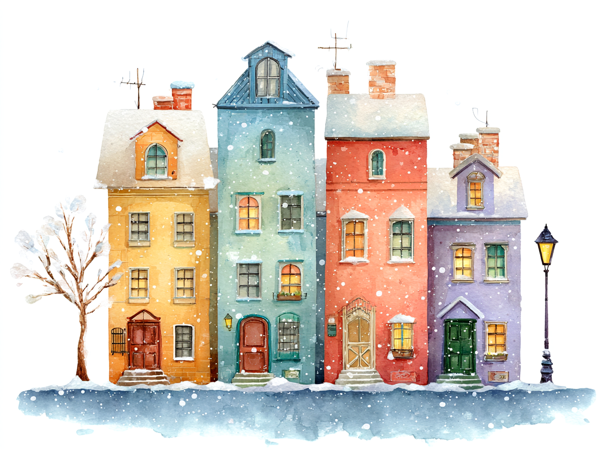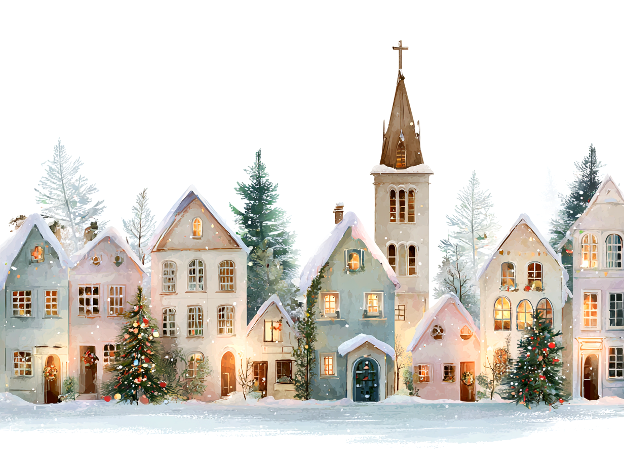 Scandinavian Christmas snowy town, cozy European houses with beige and white facades, row of charming narrow homes, snow-covered rooftops, Christmas wreaths and warm glowing string lights on windows and doors, decorated Christmas trees in front of houses, soft warm light glowing from windows, church steeple with cross visible in the background, gentle falling snow, peaceful winter atmosphere, hygge feeling, soft watercolor illustration style, delicate brush strokes, neutral soft pastel color palette, minimalistic white background, airy composition, high detail, storybook illustration, Scandinavian design aesthetic --ar 16:9 --v 6 --style raw --q 2