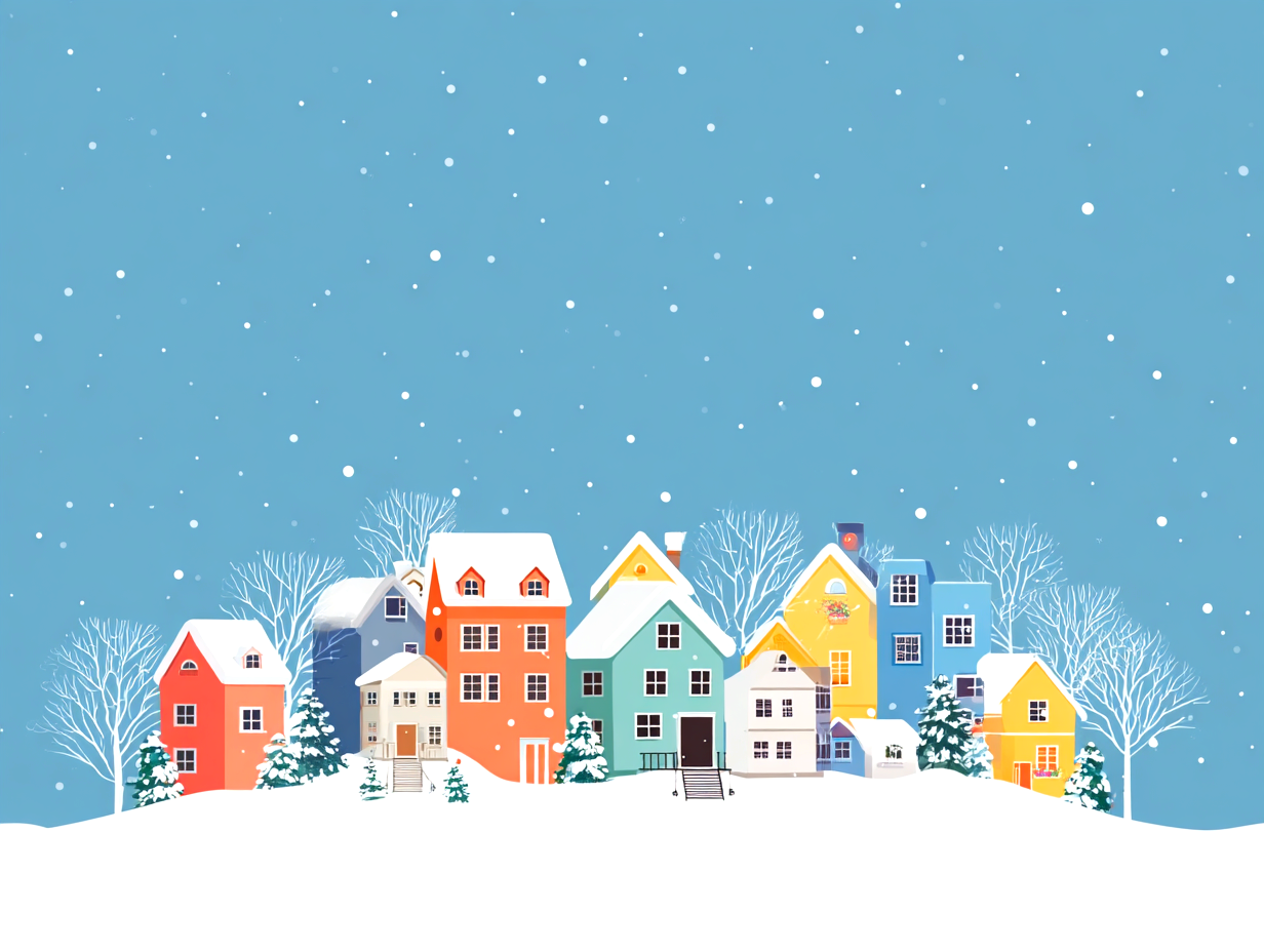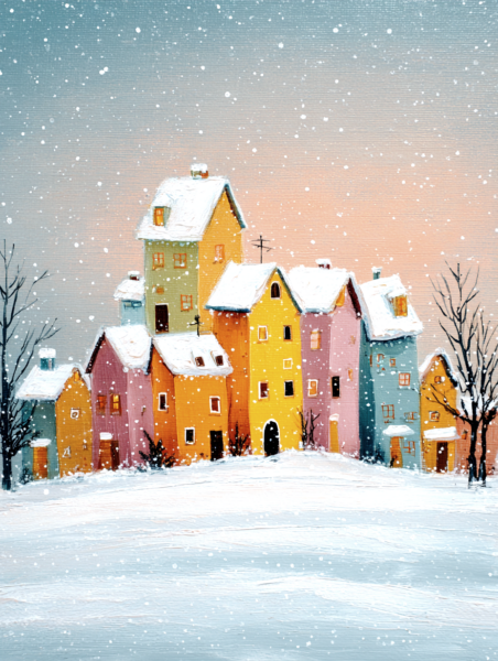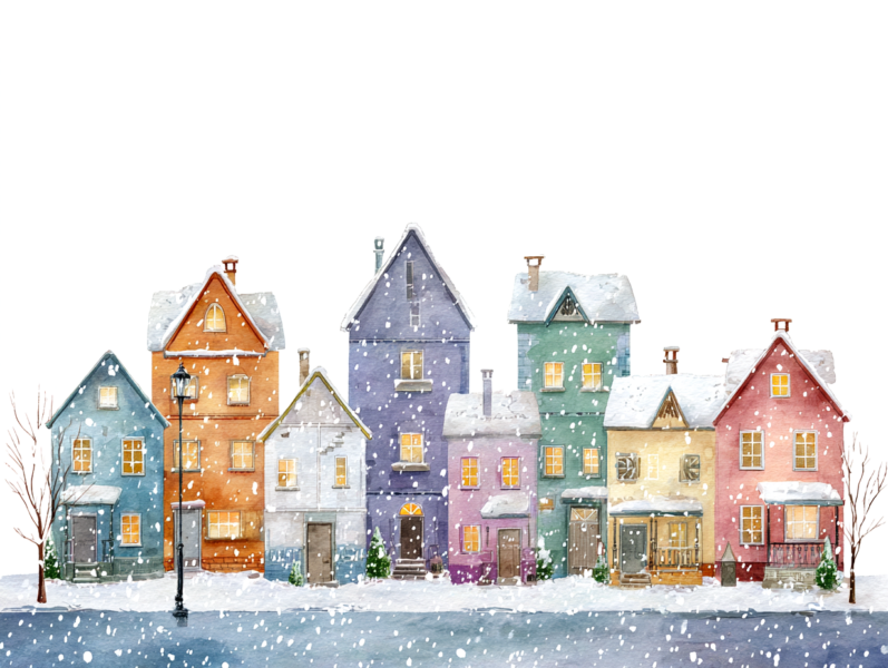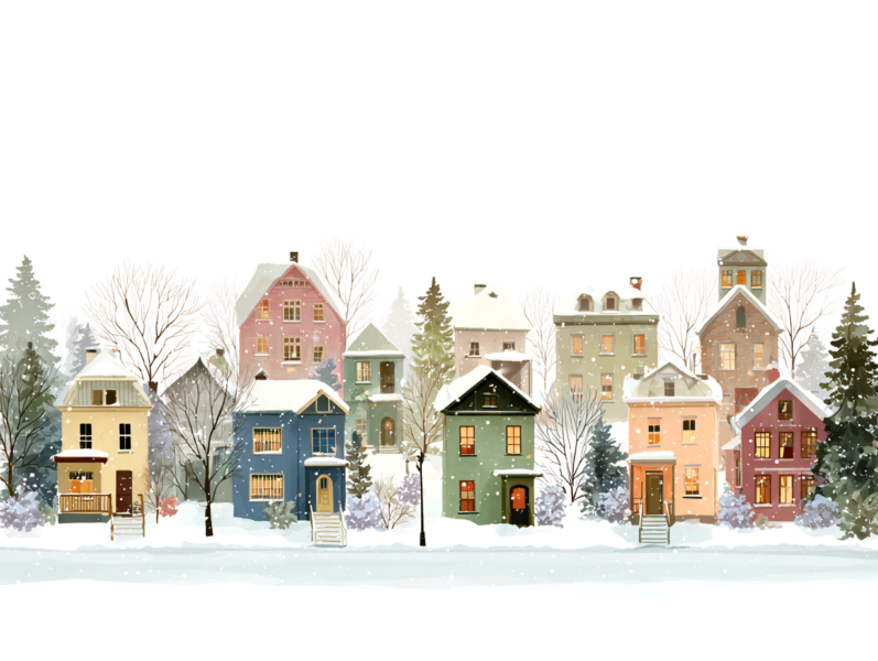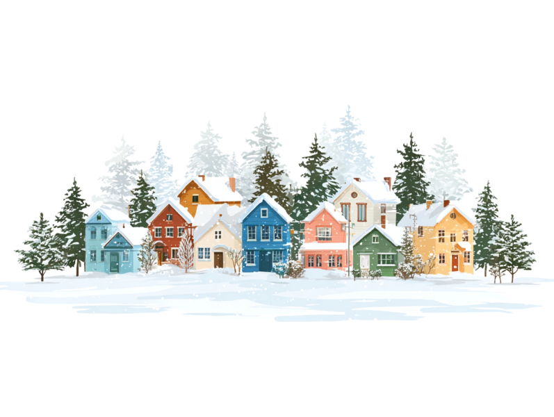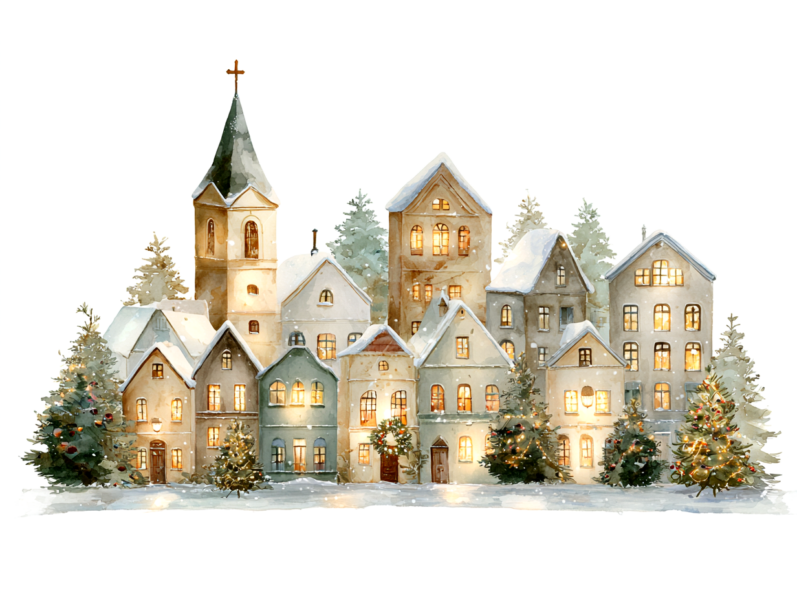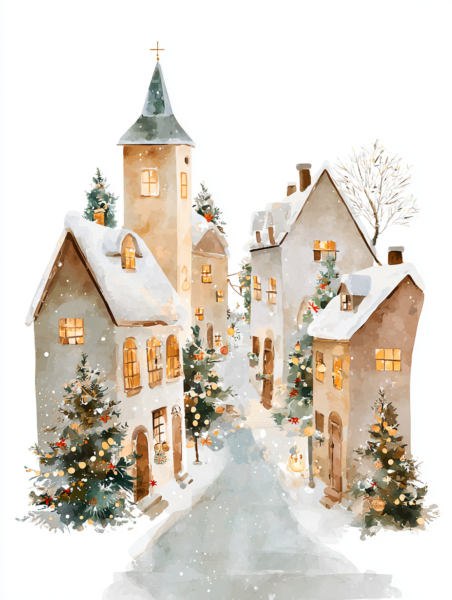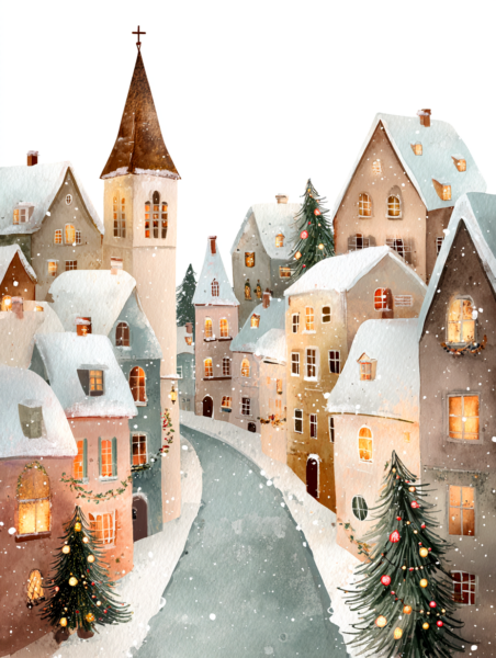 Look at this beautiful illustration. It shows a Scandinavian winter town getting ready for Christmas. The houses have lovely beige and white walls, and their roofs are covered in soft, white snow. If you look closely, you can see warm lights glowing in the windows and pretty Christmas wreaths on the doors. There is even a church with a tall spire in the background.