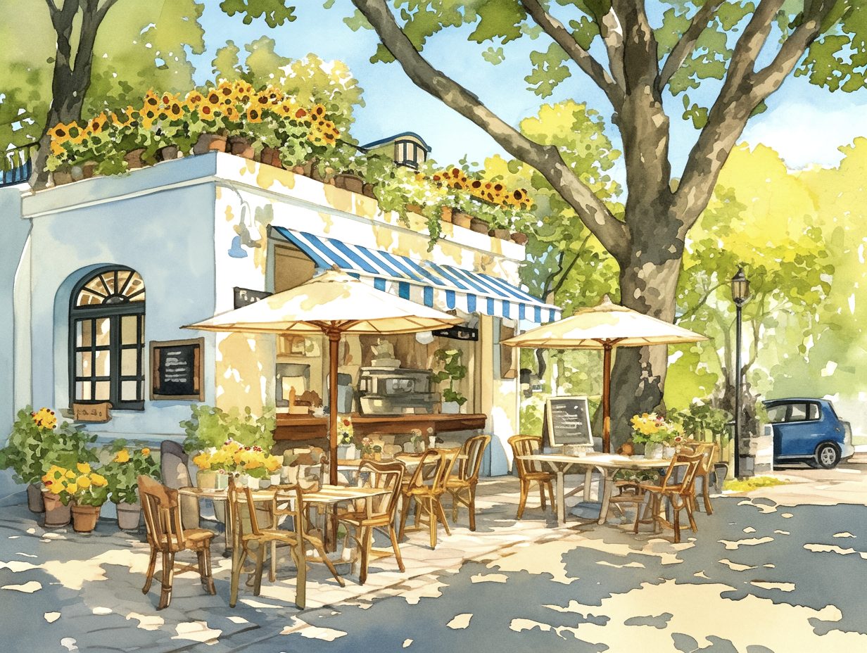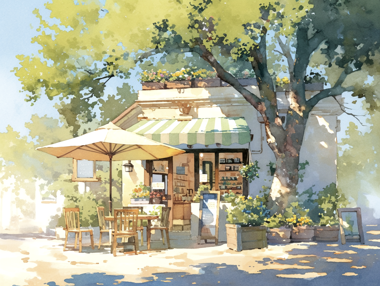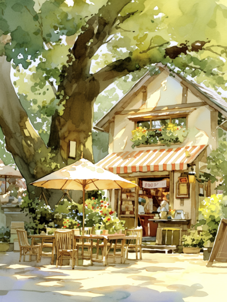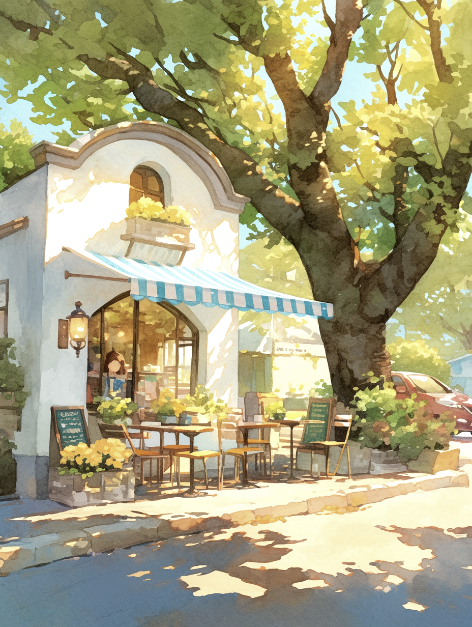 The first thing you’ll notice is the green striped awning. It gives the cafe such a classic and welcoming look. A large tree stands tall beside the shop, casting cool, soft shadows across the street. The way the sunlight filters through the leaves is captured perfectly with soft pastel colors.