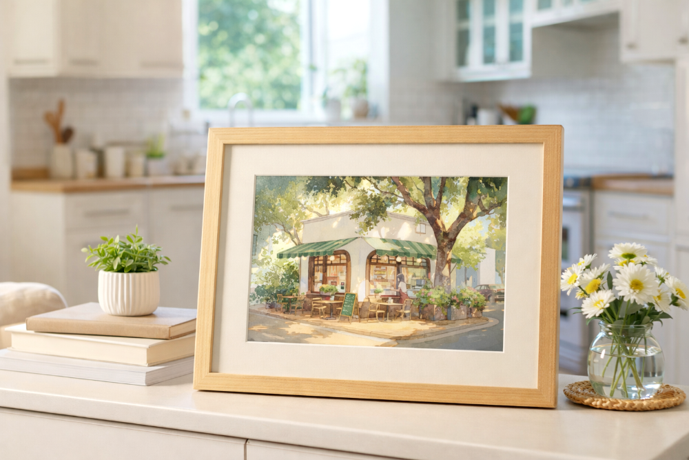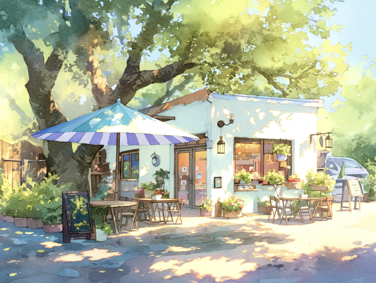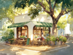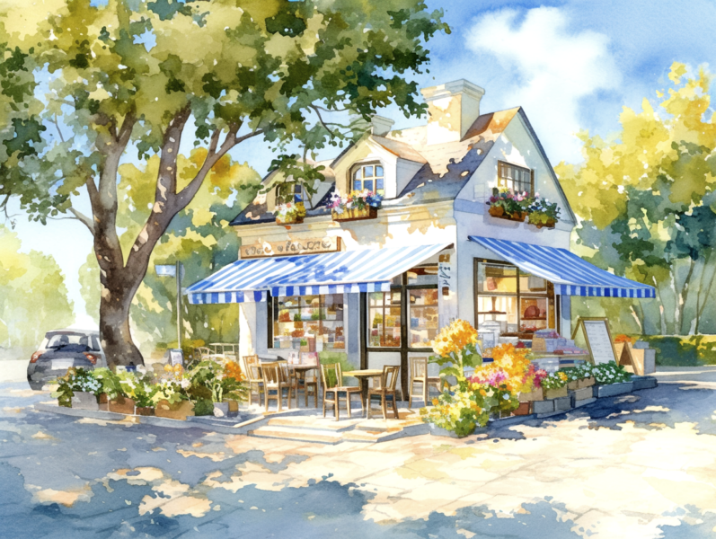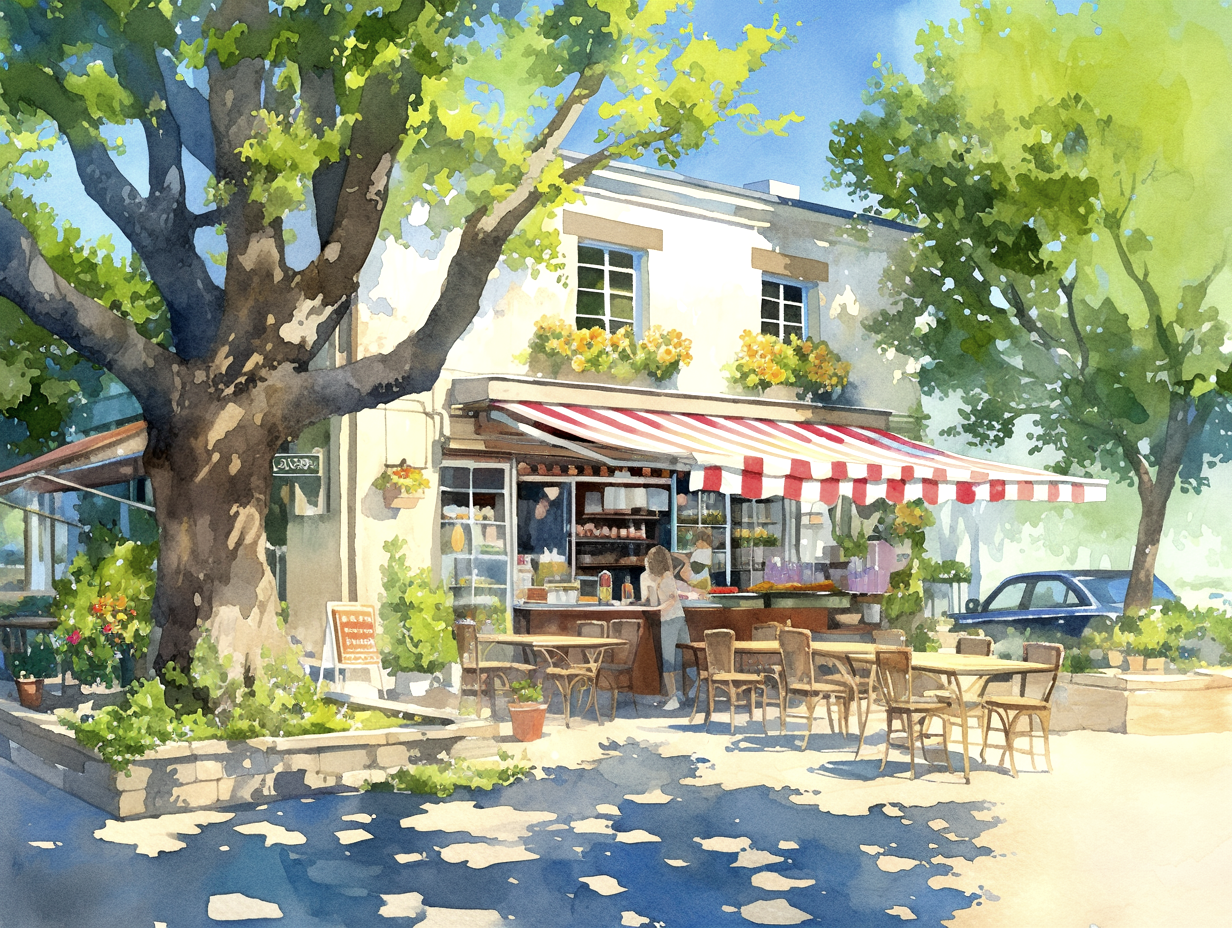 The first thing you’ll notice is the green striped awning. It gives the cafe such a classic and welcoming look. A large tree stands tall beside the shop, casting cool, soft shadows across the street. The way the sunlight filters through the leaves is captured perfectly with soft pastel colors.