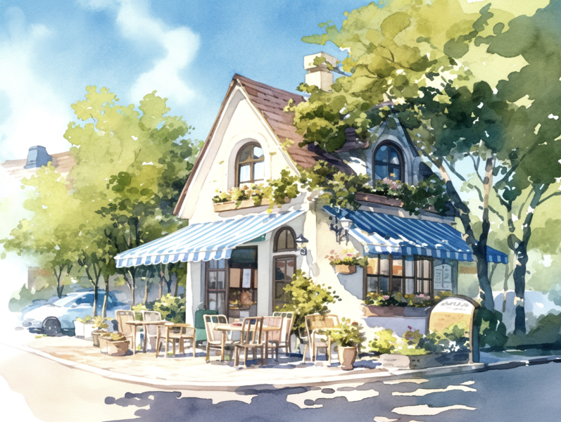 Please take a look at this beautiful watercolor painting. It is a scene of a cozy cafe tucked away in a quiet park. Whenever I look at it, I can almost feel the gentle breeze of an early summer day.