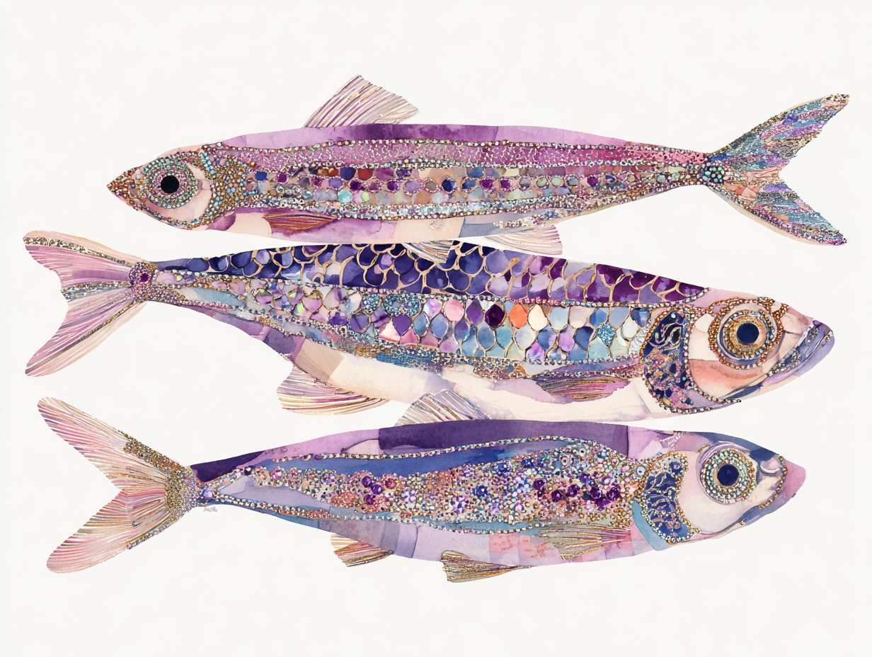 Look at these three mysterious fish. Aren’t they lovely? They are colored like amethyst (a beautiful purple gemstone) and shine with glitter, pearls, and rhinestones. The style is a mix of watercolor and collage, which gives it a dreamy and "retro" feeling. The white background makes the purple and gold colors really pop!