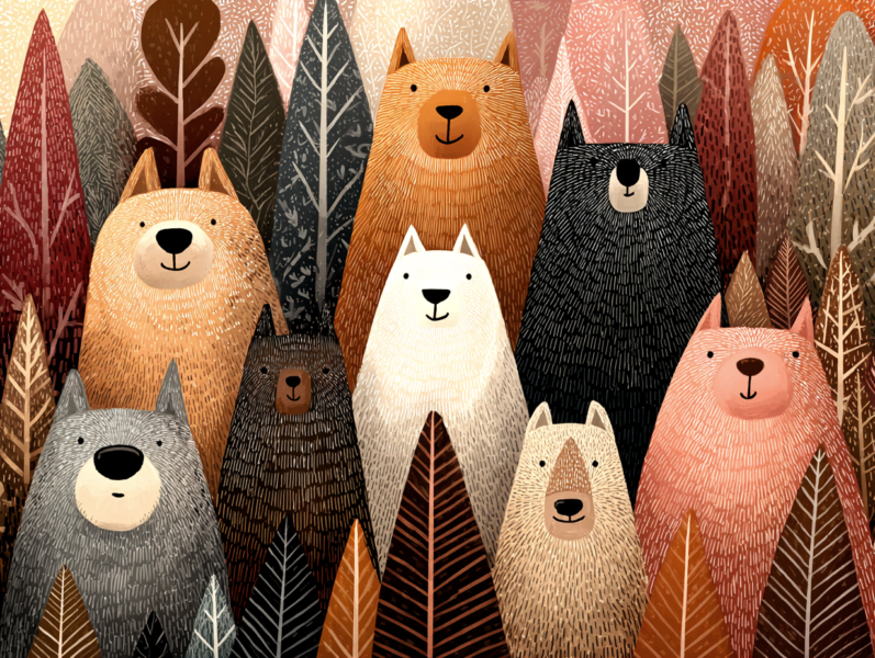 In this picture, a group of animal friends has gathered in a magical forest. If you look closely, it looks like they are having a happy "forest choir" session! There are colorful bears—yellow, grey, white, and black—and even a tiny white bunny.