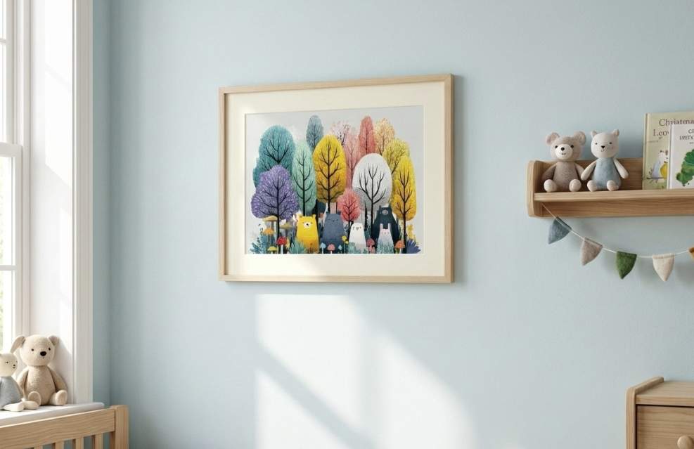 The forest is filled with trees in beautiful colors like bright yellow, soft pink, and cool blue. The tiny mushrooms on the ground add a playful touch. The clean white background makes the whole image feel bright and cheerful, just like a page from a lovely picture book.