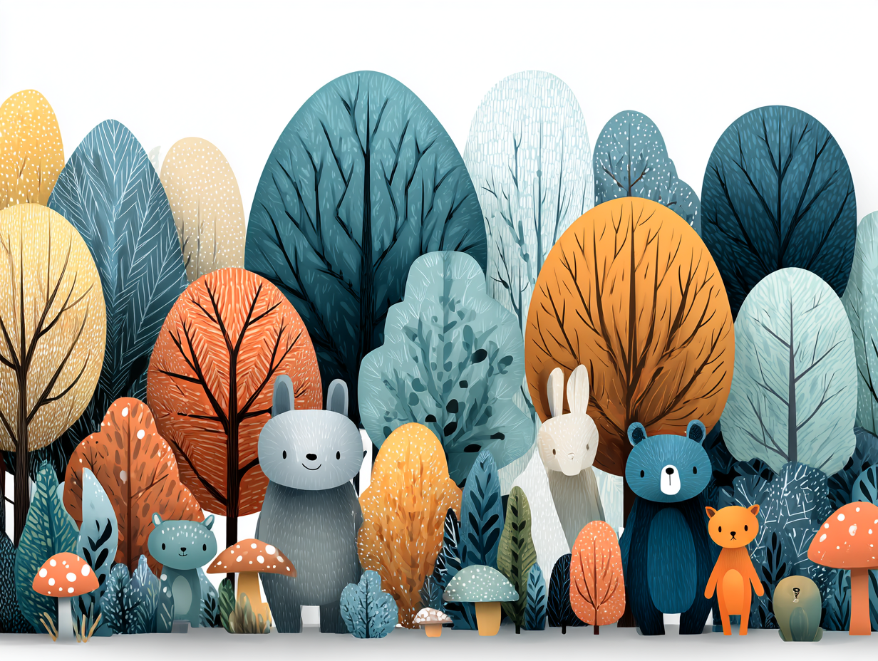 storybook-style illustration, many cute animals gathered in a forest, happily singing together like a cheerful choir, adorable bears, rabbits, foxes and small animals, simplified and rounded shapes, gentle and joyful expressions, colorful layered trees forming a whimsical forest, small mushrooms and plants scattered around, playful and magical atmosphere, Scandinavian illustration style, flat design with subtle textures, muted blues, oranges and mustard tones, clean white background, spacious composition with lots of negative space, cheerful and lighthearted mood, children’s picture book illustration, high quality