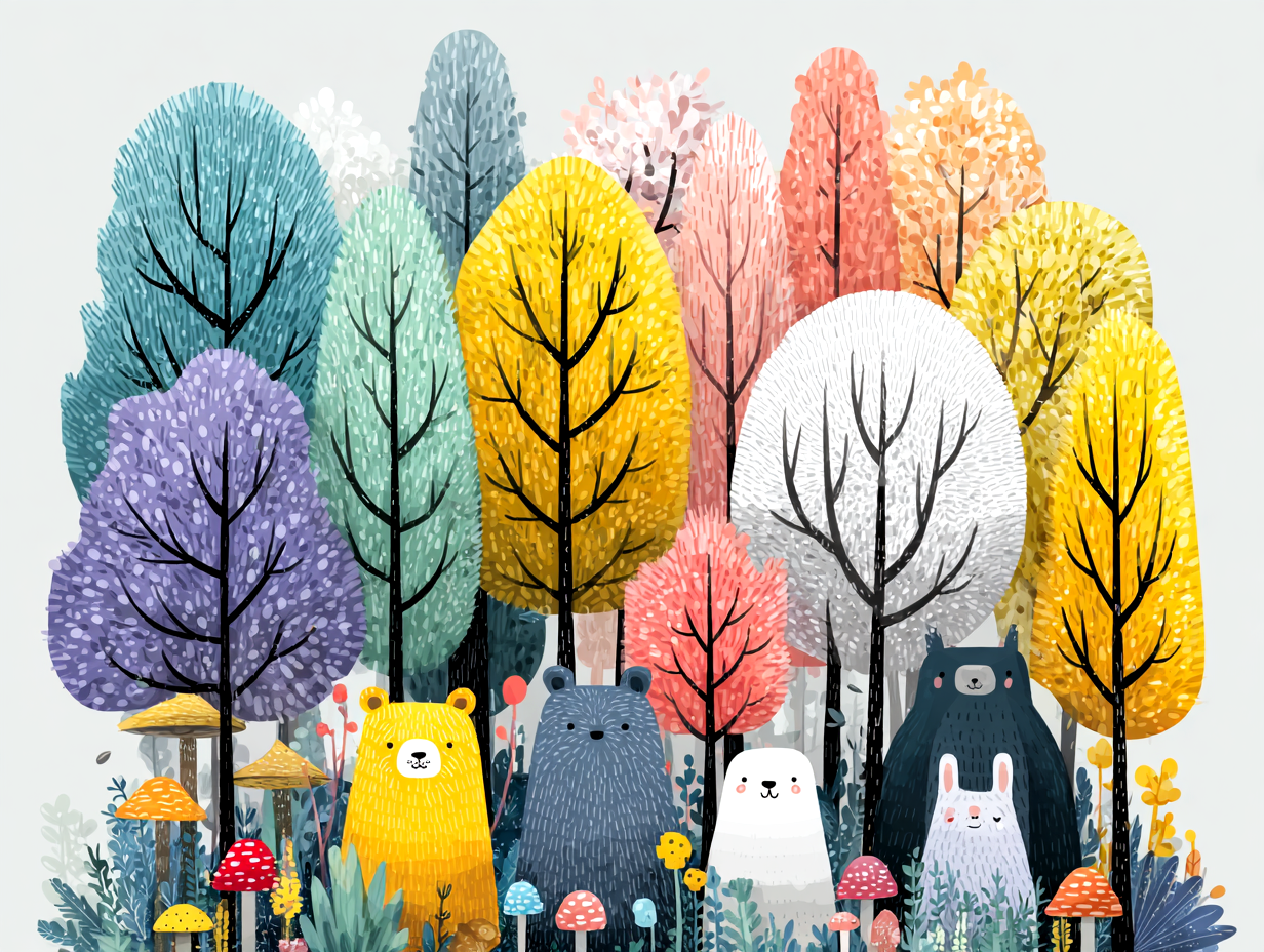 The forest is filled with trees in beautiful colors like bright yellow, soft pink, and cool blue. The tiny mushrooms on the ground add a playful touch. The clean white background makes the whole image feel bright and cheerful, just like a page from a lovely picture book.