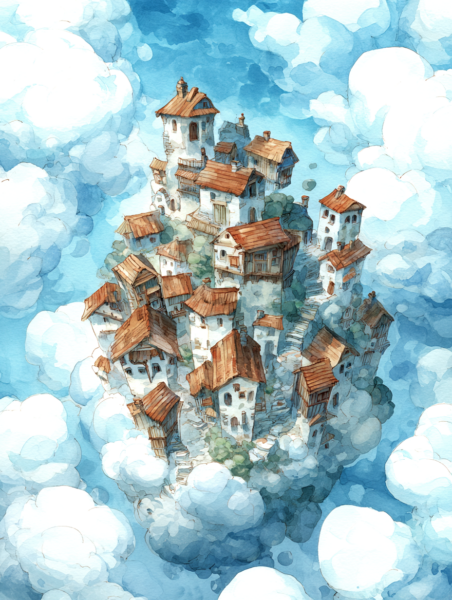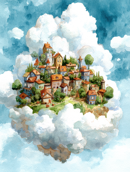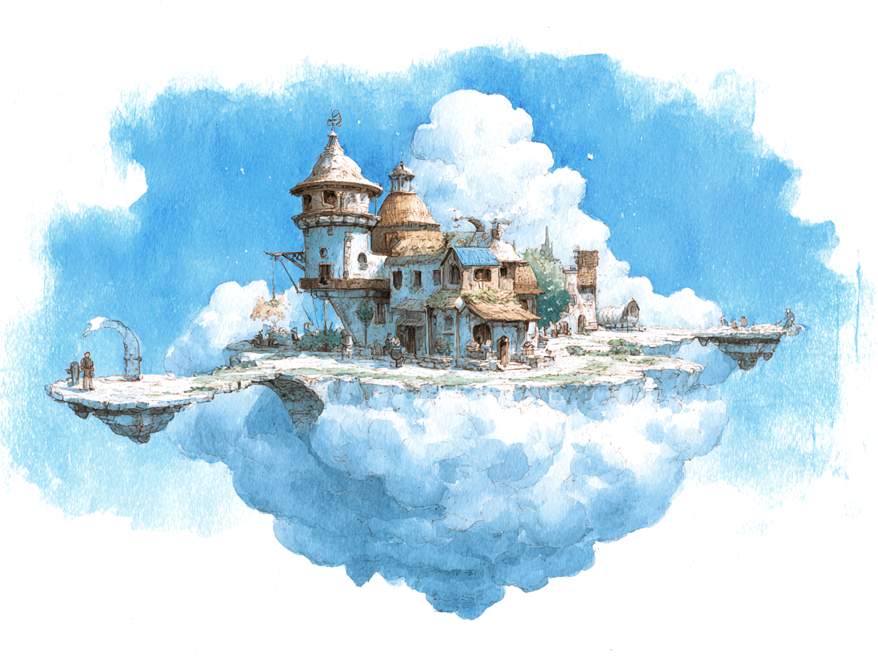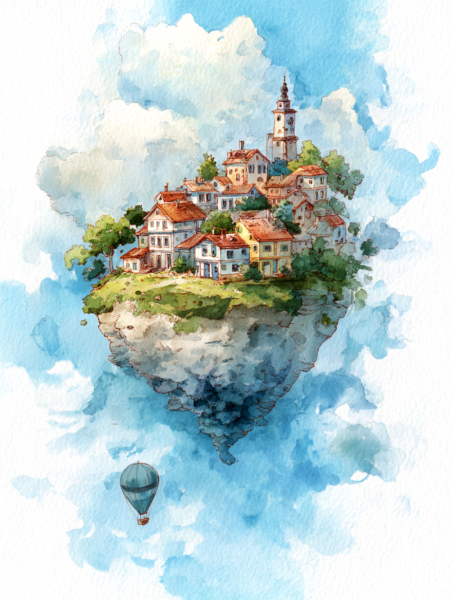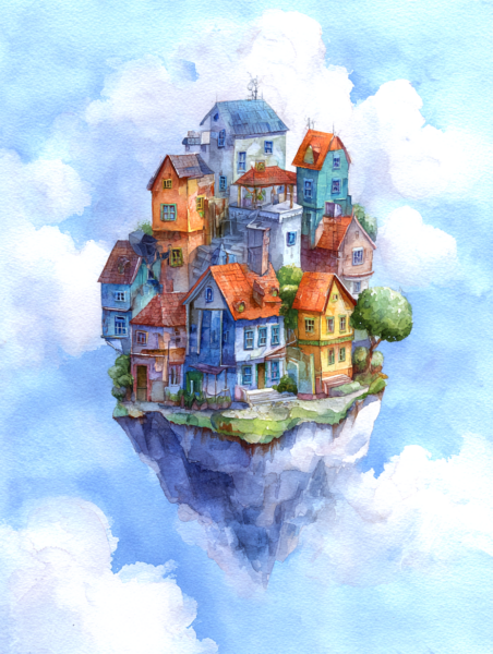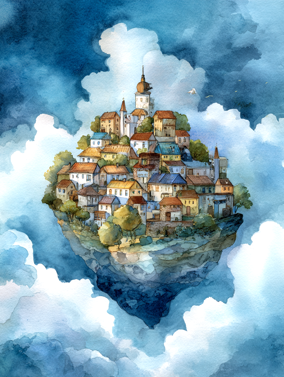 This watercolor painting shows a legendary island floating high in the blue sky. Its style is inspired by classic British children’s books from the 1930s. In this world, the island drifts slowly through the soft clouds, far away from the busy noise of the ground.