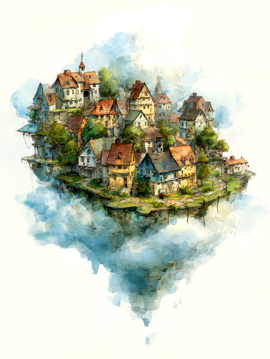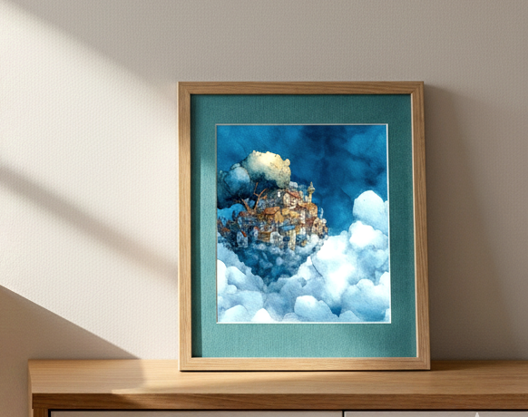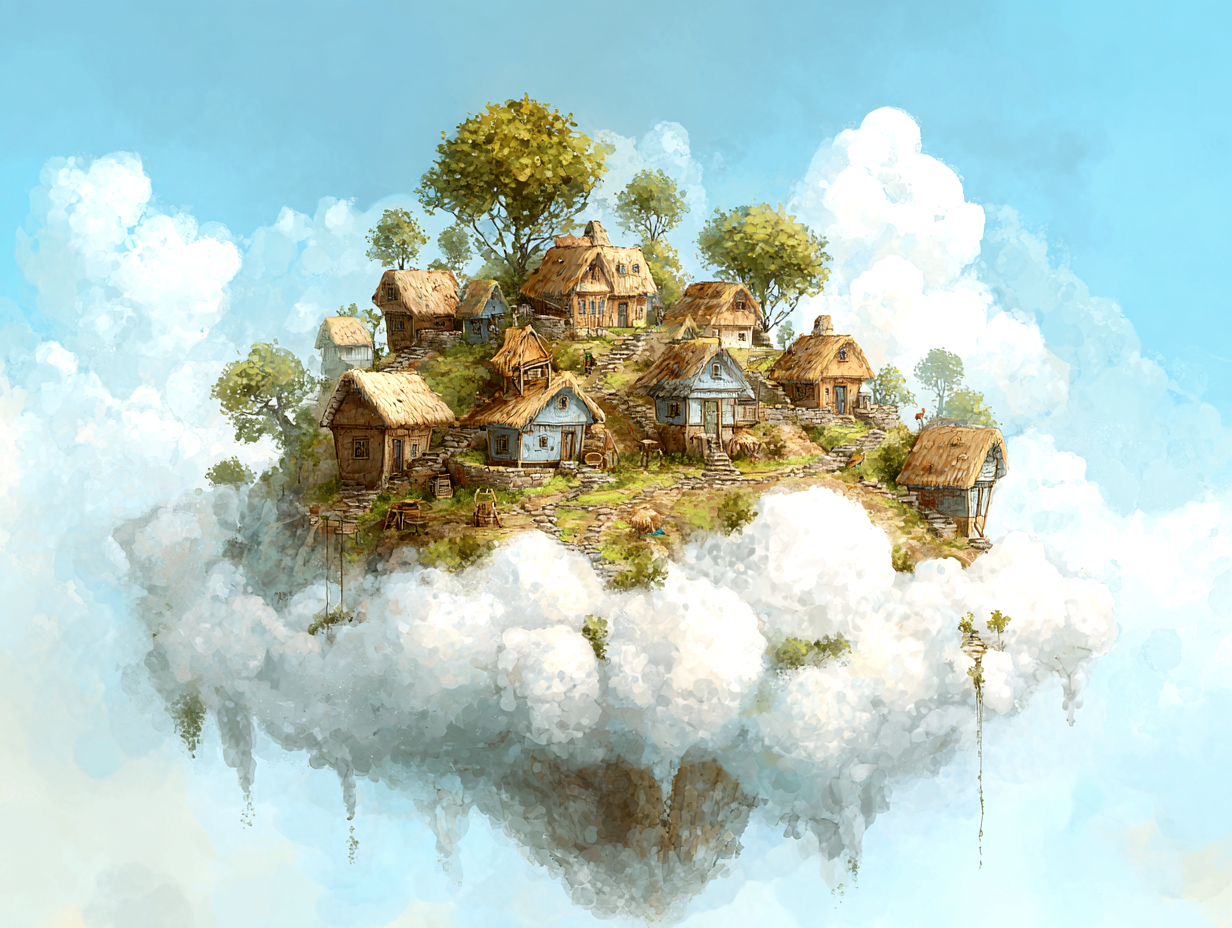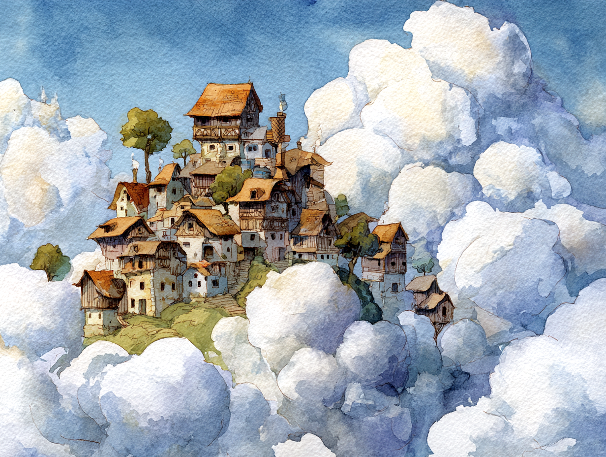 This watercolor painting shows a legendary island floating high in the blue sky. Its style is inspired by classic British children’s books from the 1930s. In this world, the island drifts slowly through the soft clouds, far away from the busy noise of the ground.