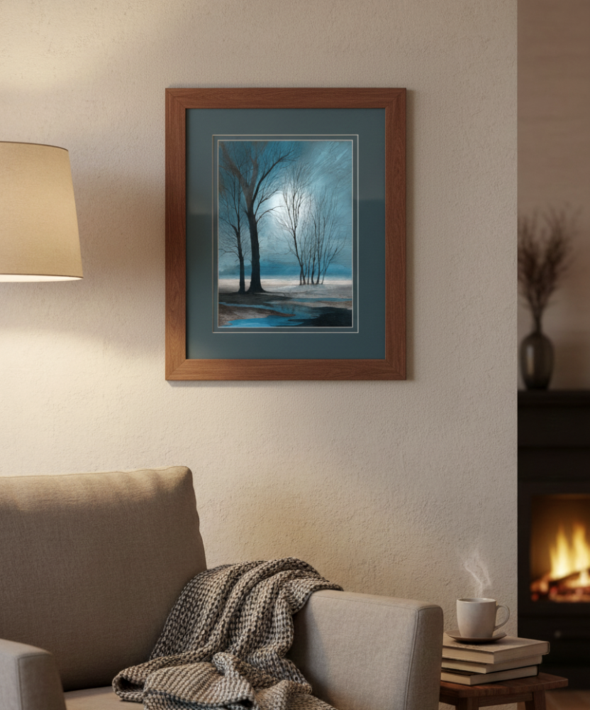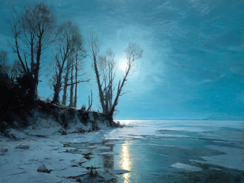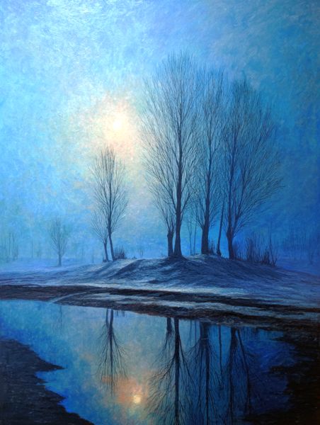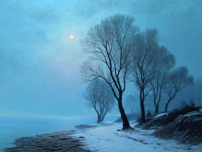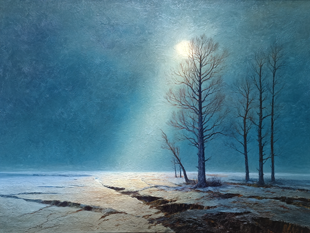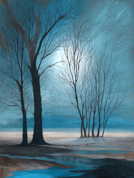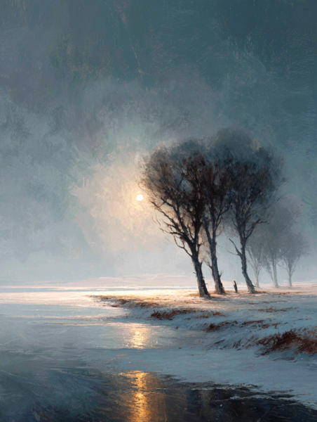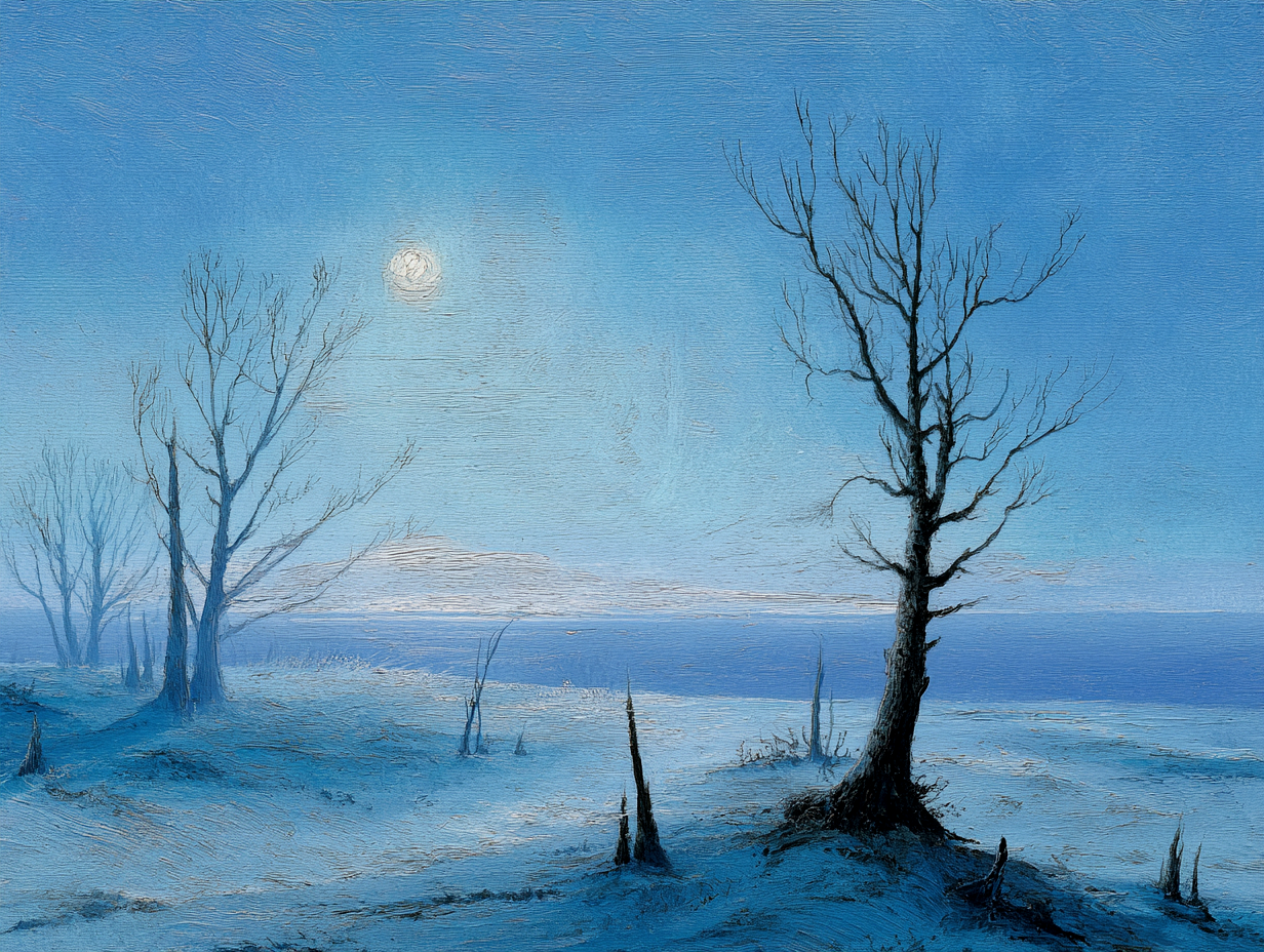 A moonlit winter landscape with bare trees standing on a frozen plain, a quiet icy shoreline in the foreground, cold air and deep silence, illuminated by soft moonlight filtering through mist, dominated by deep blues and pale cyan tones, expressing the harshness and stillness of winter, an atmosphere suspended between reality and fantasy, dreamlike yet believable, photorealistic composition with painterly qualities, fine art oil painting texture, visible brush strokes on canvas, subtle grain, cinematic lighting, soft glow, melancholic and tranquil mood, ultra-detailed, high realism, no people, no animals --ar 2:3 --v 6 --style raw --chaos 20 --quality 1