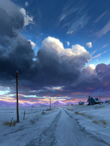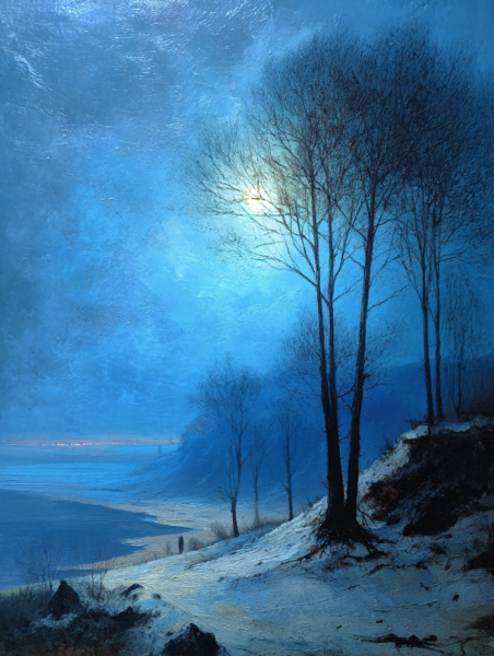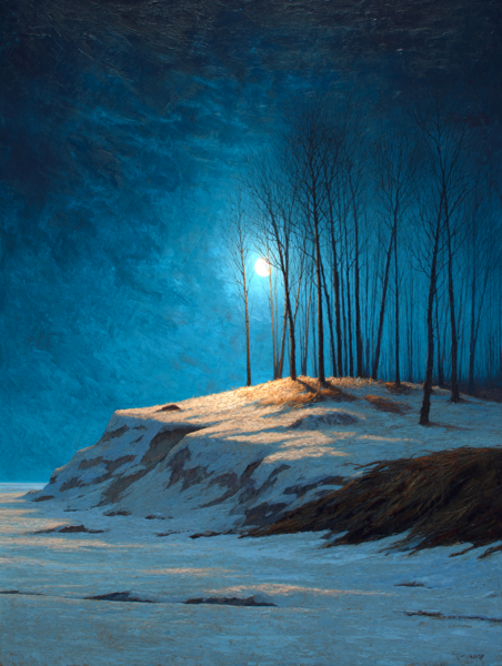 Please take a look at this image. It shows a winter landscape under the soft, glowing light of the moon. At first glance, it is hard to tell if this is a photograph or an oil painting. The texture is rich and detailed, but the colors feel like they are from a beautiful dream.