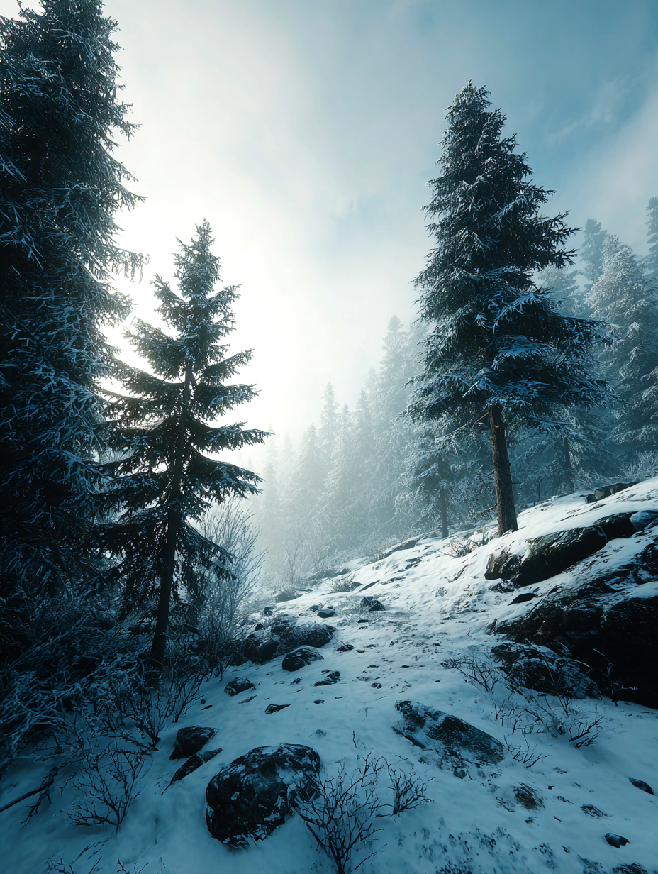 The deep teal and icy blues create a feeling of "cold silence." The image captures both the harshness of winter and its quiet, mysterious beauty. Is it a real place, or is it a fantasy world? When I look at it, I feel like I am standing in a quiet forest where time has stopped.