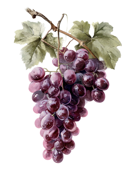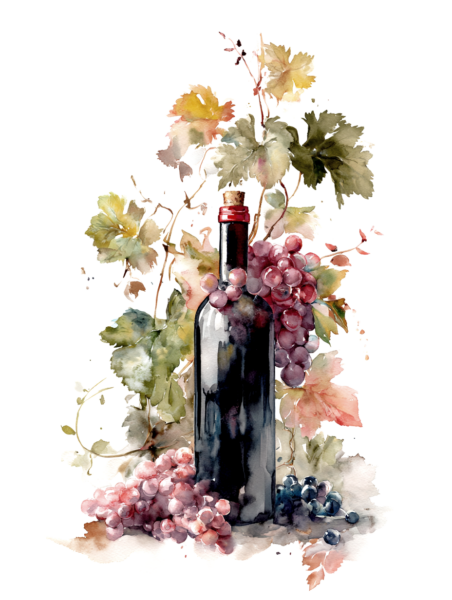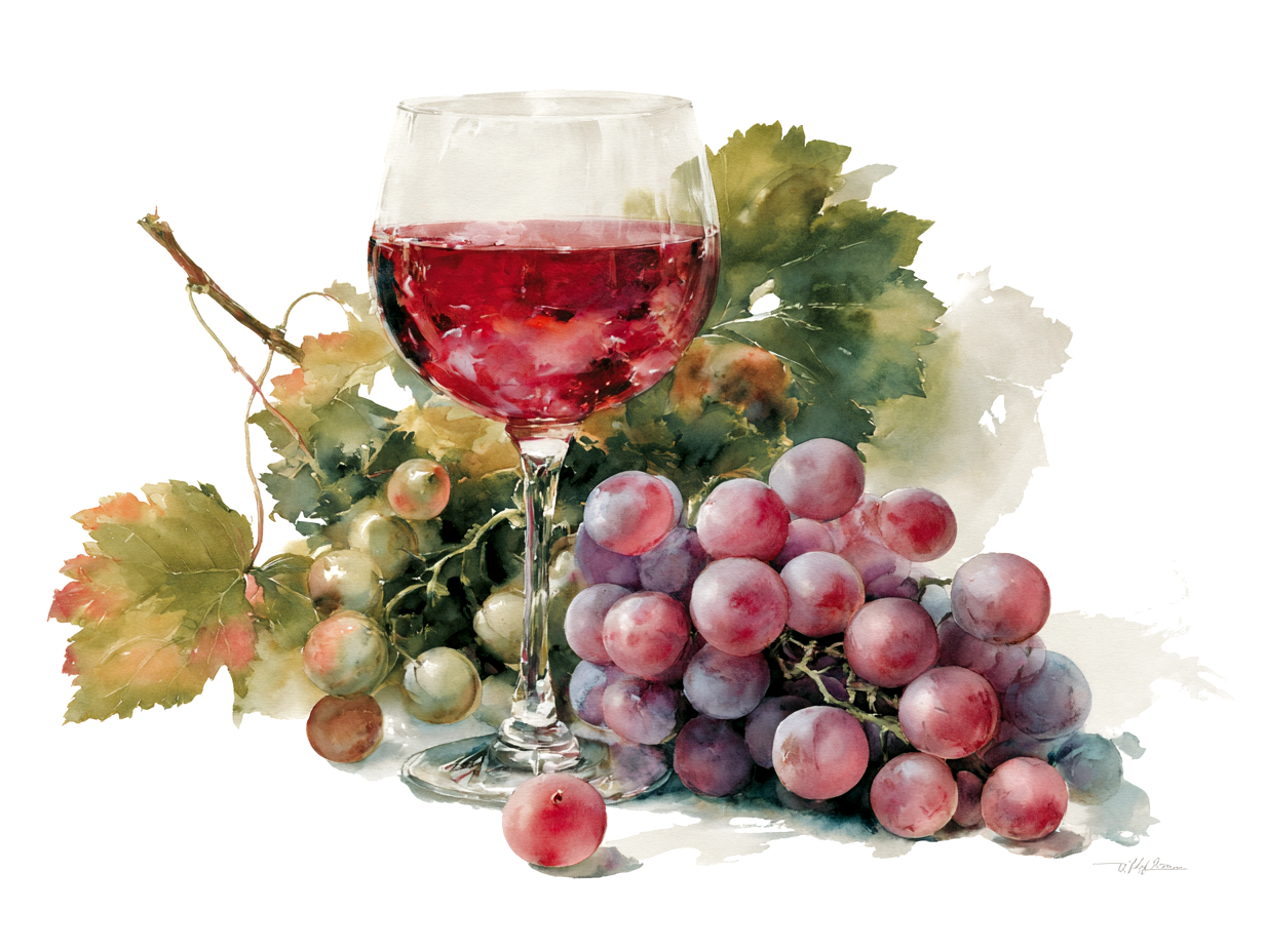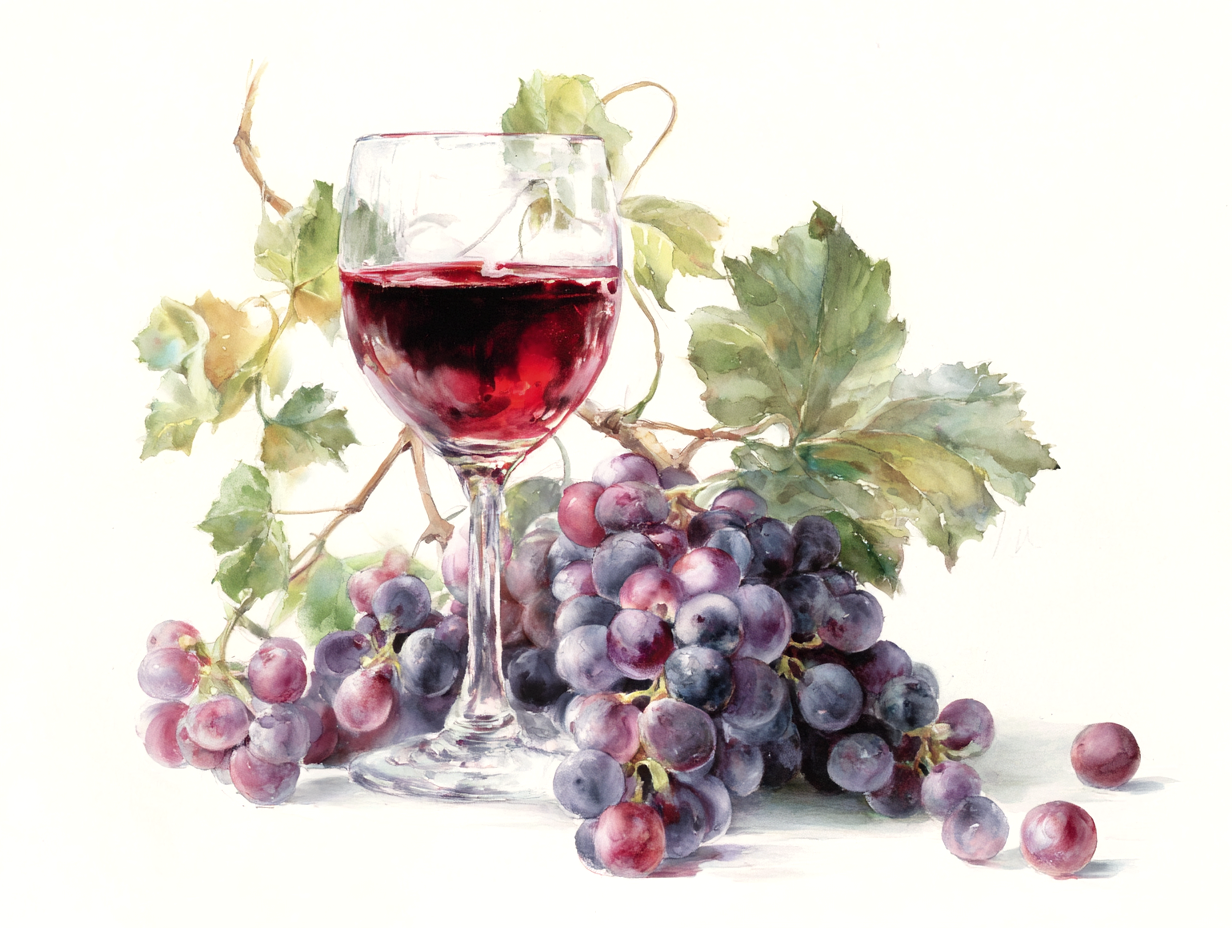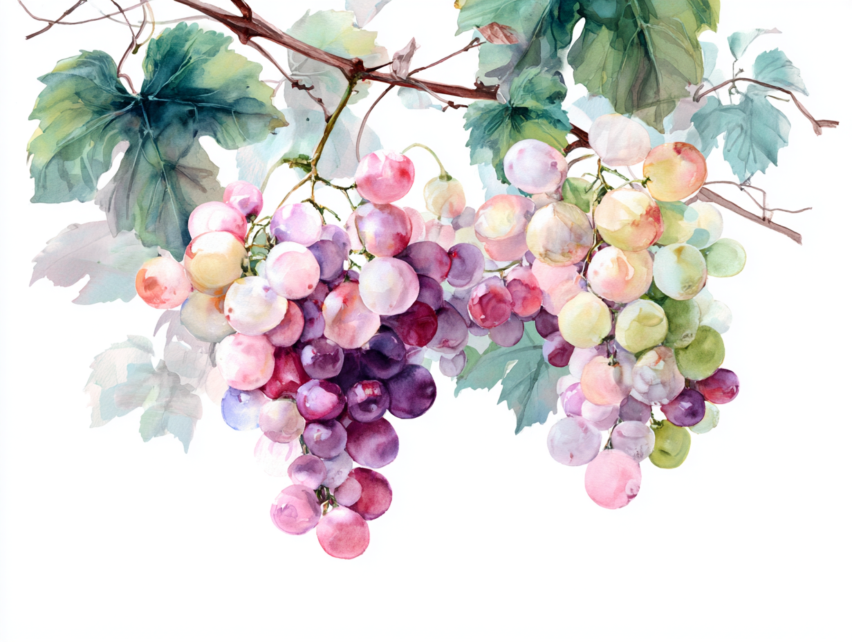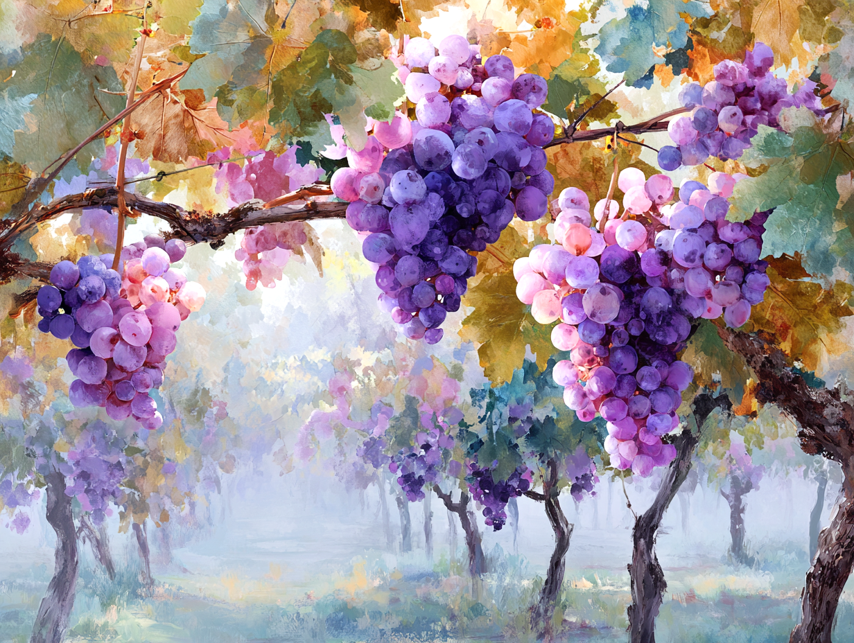 A dreamlike watercolor painting of a vineyard wrapped in soft morning mist, rows of grapevines forming a gentle path into the distance. Intertwined grape vines with semi-transparent leaves, clusters of pale lavender and soft purple grapes hanging heavily. Soft Rembrandt-style morning sunbeams filtering through the fog, creating a mystical and serene atmosphere.