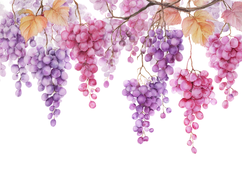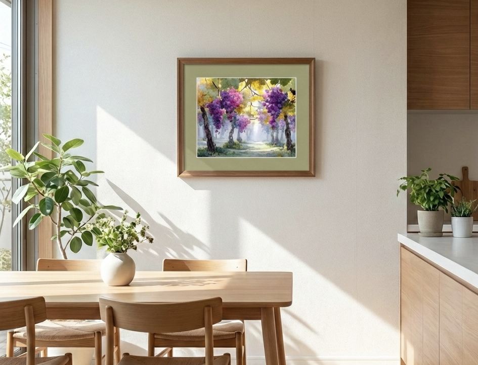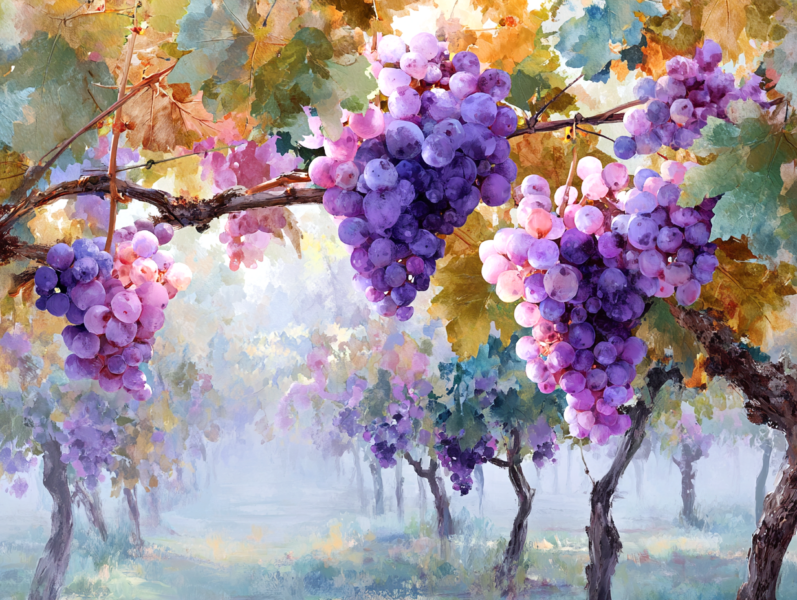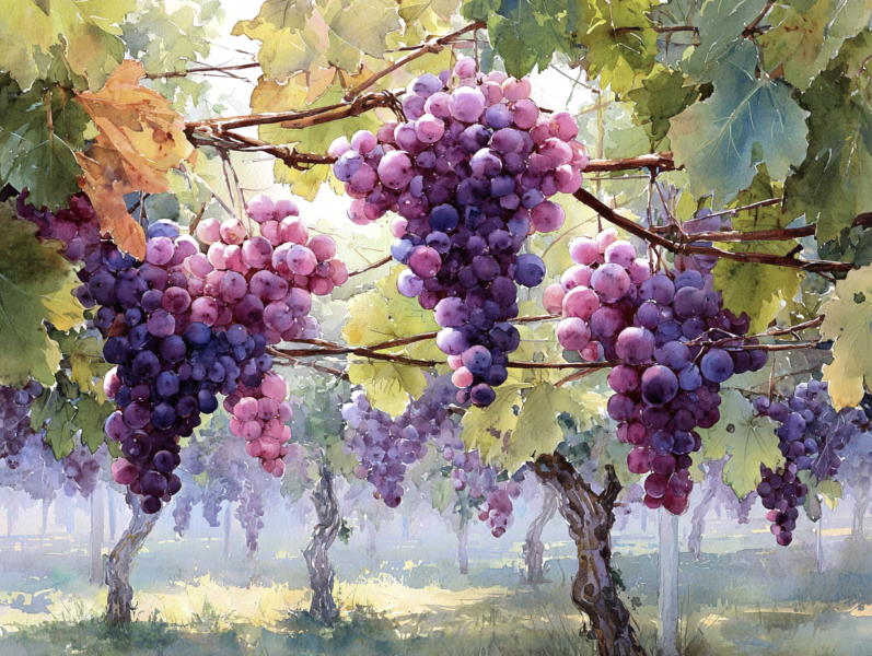 Hi, I want to share this beautiful watercolor painting with you. It shows a dreamy vineyard covered in soft morning mist. You can see lovely purple grapes hanging from the vines and light green leaves. The sunlight shining through the fog looks magical and mysterious, creating a very peaceful feeling.