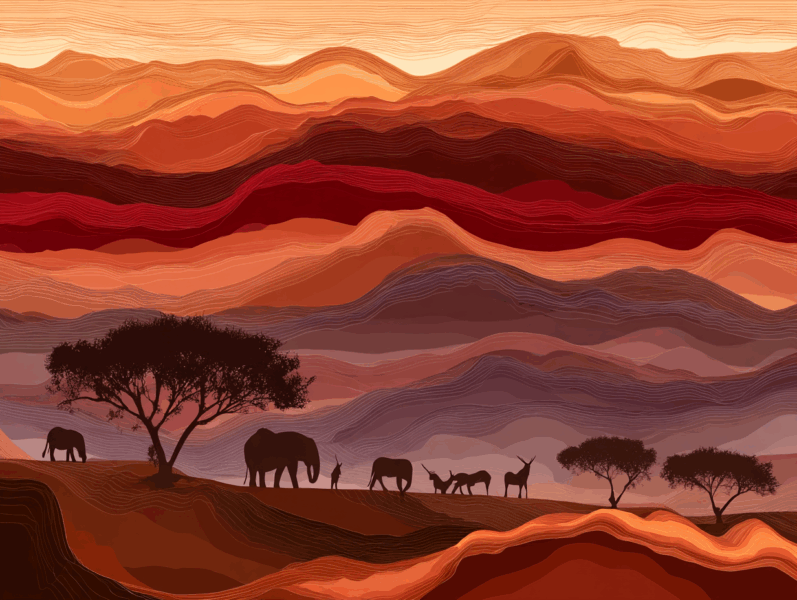 A stylized landscape illustration of the Namibia Desert at sunset, featuring flowing, layered undulating sand dunes in a dramatic gradient of deep reds, warm oranges, crimson, and purples. Silhouetted acacia trees and wildlife, including oryx and a zebra, are positioned against the glowing horizon. The art style is abstract and minimalist, resembling stacked paper cut-outs and topographic lines with delicate line patterns and textures across the surfaces. Cinematic lighting, high contrast, atmospheric. --ar 4:3 --s 750 --v 6.0