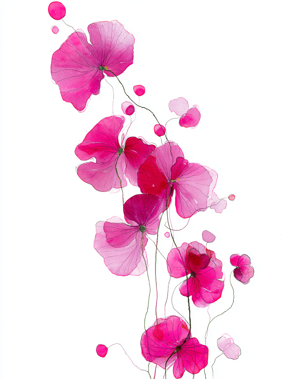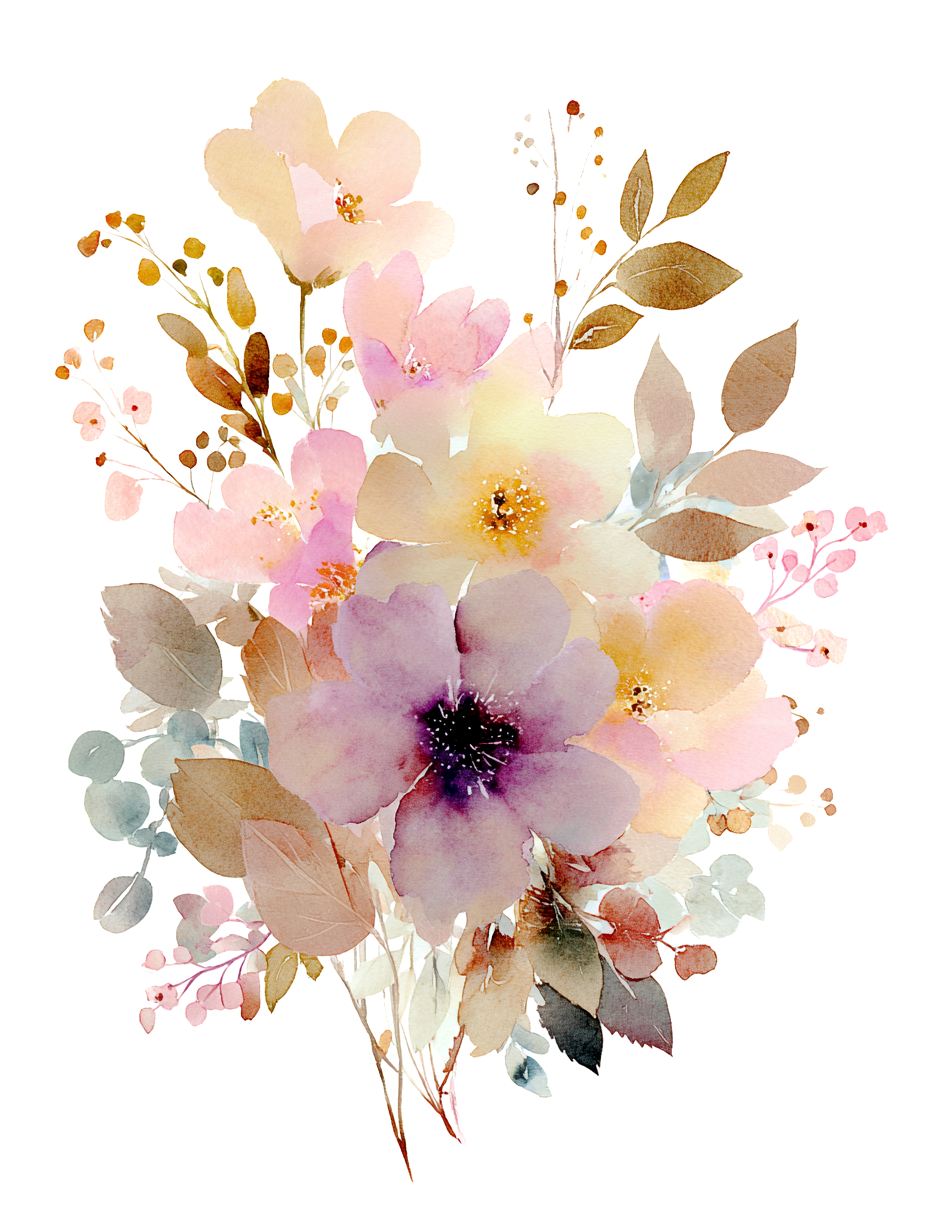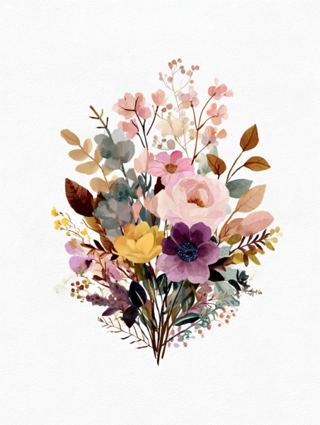 This illustration is a watercolor painting of a lovely flower bouquet. It features many colors like soft pink, sunny yellow, deep purple, and calming greens. All these colors work together perfectly to create a peaceful and poetic feeling. The delicate strokes make the flowers look like they are dancing on the paper. It’s like a warm, soft hug for your eyes!