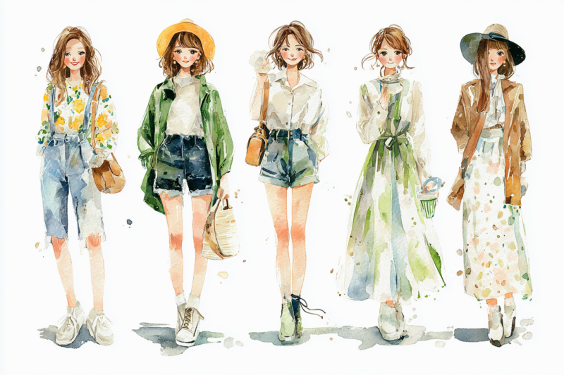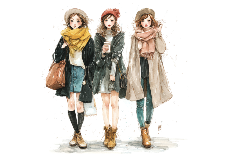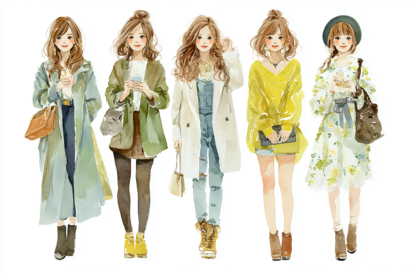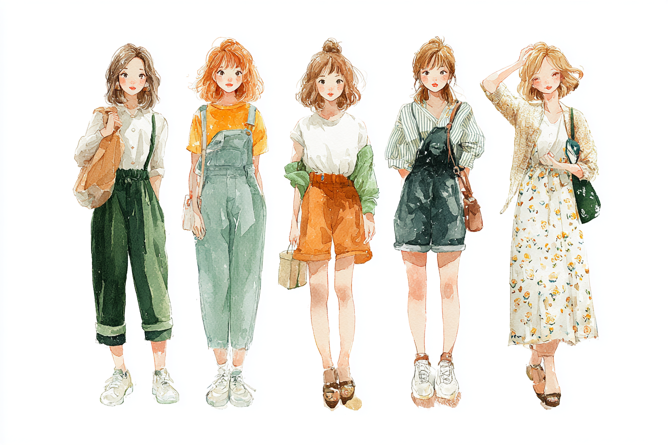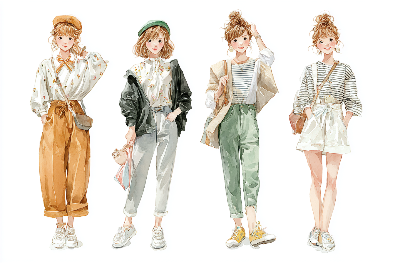 I created a unique illustration inspired by the trendy streets of Shibuya, Harajuku, and Omotesando. This artwork features four fashionable girls wearing casual, playful outfits perfect for seasons. The style is a soft watercolor painting, looking just like a sketch from a talented fashion design student.