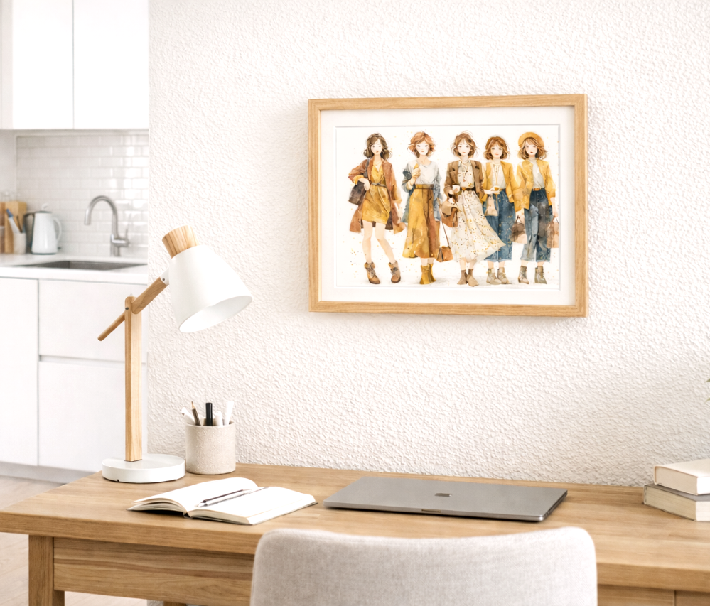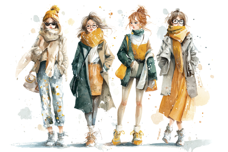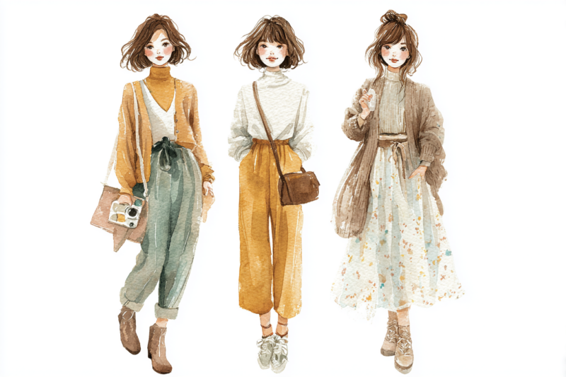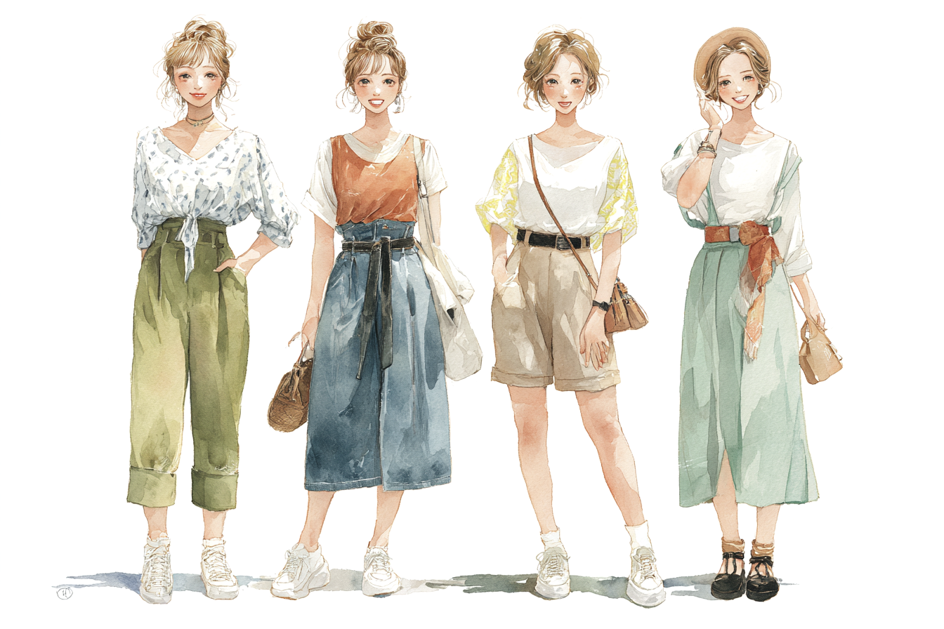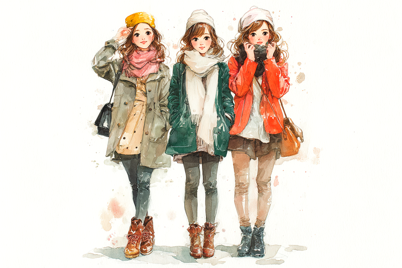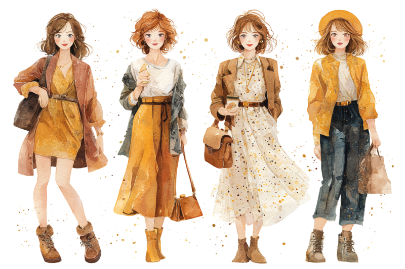 I created a unique illustration inspired by the trendy streets of Shibuya, Harajuku, and Omotesando. This artwork features four fashionable girls wearing casual, playful outfits perfect for seasons. The style is a soft watercolor painting, looking just like a sketch from a talented fashion design student.